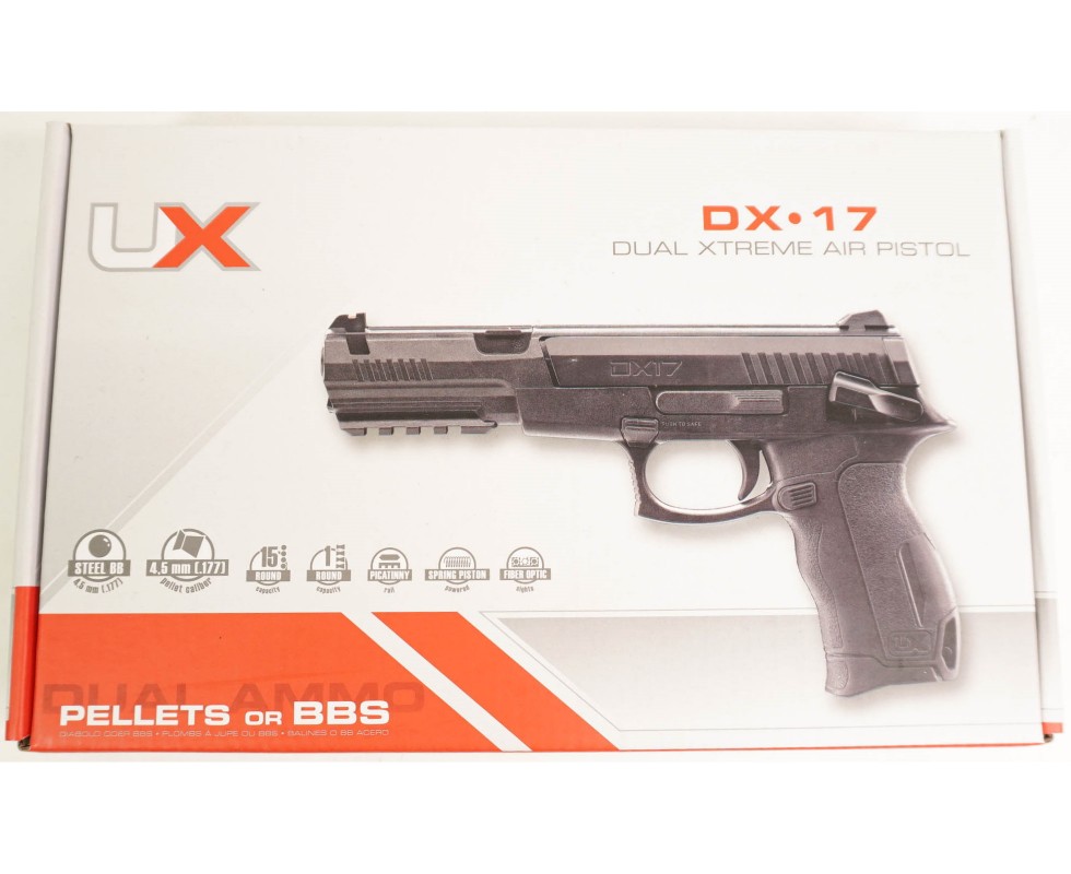 Пневматический пистолет Umarex DX17 – это немецкая пружинно-поршневая пневматика отличного качества, выполненная на предприятии компании Умарекс. Модель не имеет огнестрельного прототипа, и является разработкой германского бренда. За счет использования пружины в качестве движущей силы пистолет Umarex DX17 имеет доступную цену, отличается практичностью и простотой эксплуатации.
