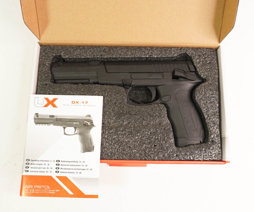Корпус изделия пластиковый. Имеются штатные целик и мушка, неподвижные. Под столом у Umarex DX17 установлена рельса для стрелковых аксессуаров. Весит модель 0,44 кг, длина 24 см. Комплект поставки включает инструкцию, упаковка – картонная коробка.