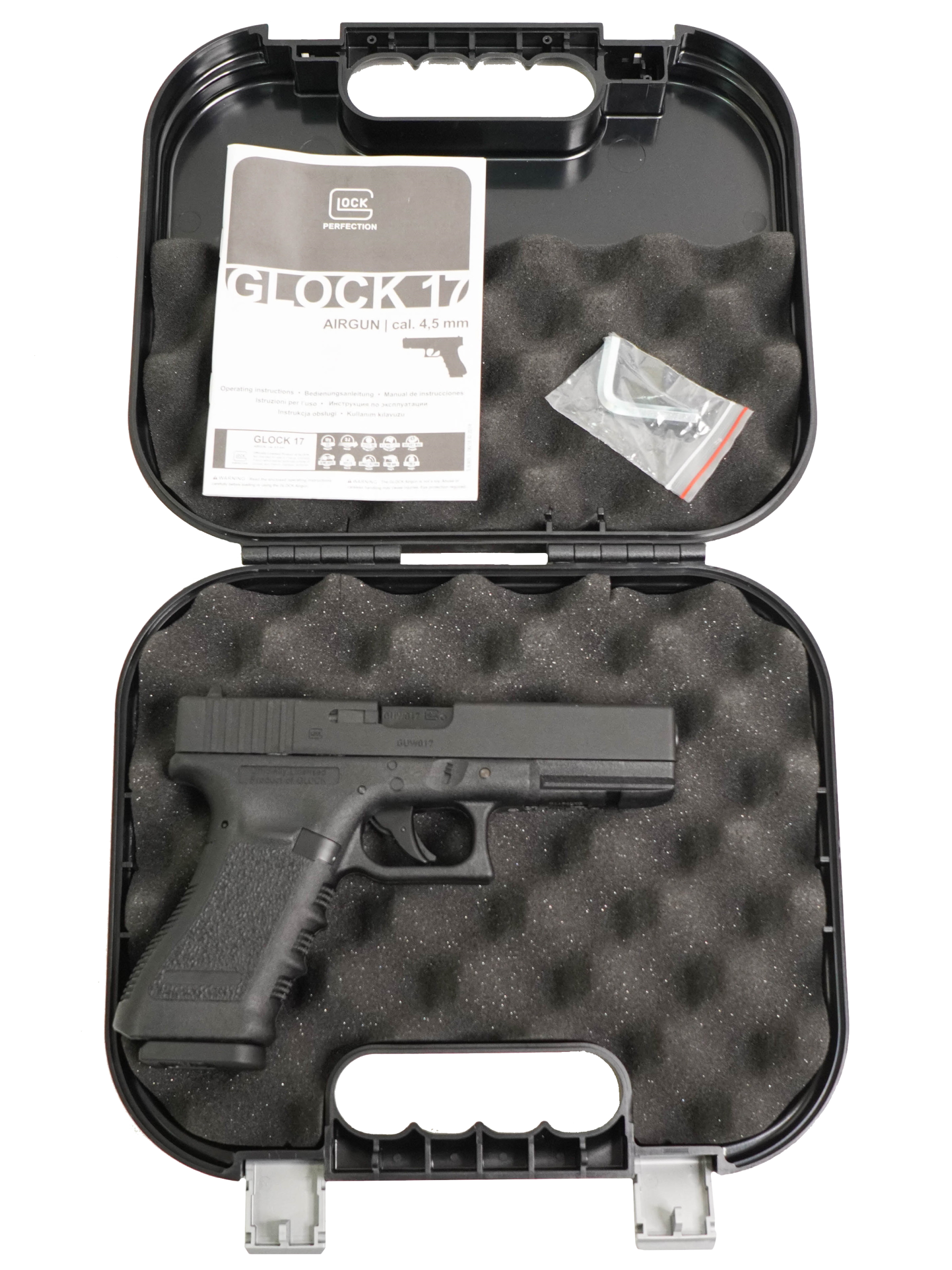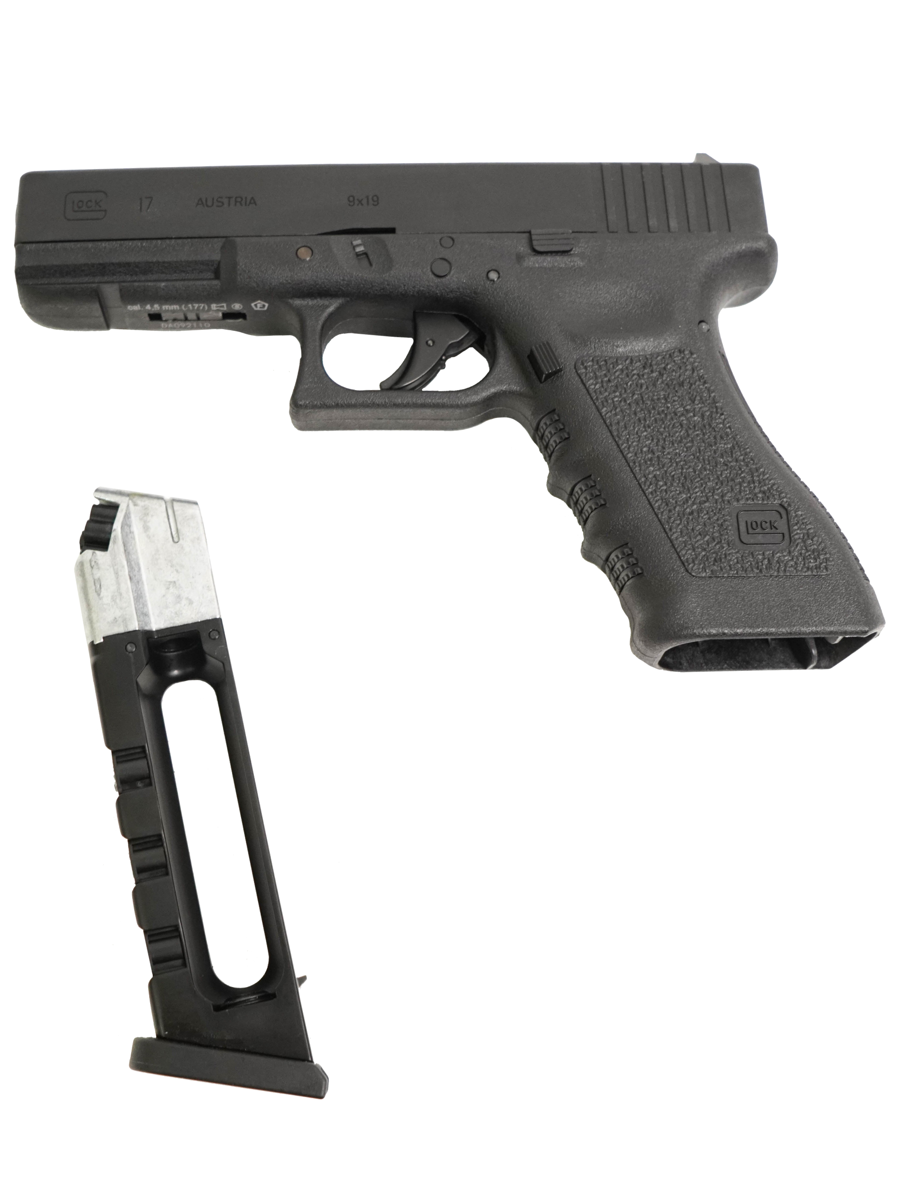 Пневматический пистолет Umarex Glock 17 (blowback, BB/pellet) (5.8365) – это выпущенный по лицензии аналог известного боевого пистолета, красивое и качественное газобаллонное вооружение для развлечений и хардбола. Пистолет работает от энергии газа, заключенного в баллончик на 12 г, он установлен в отсек рукоятки.