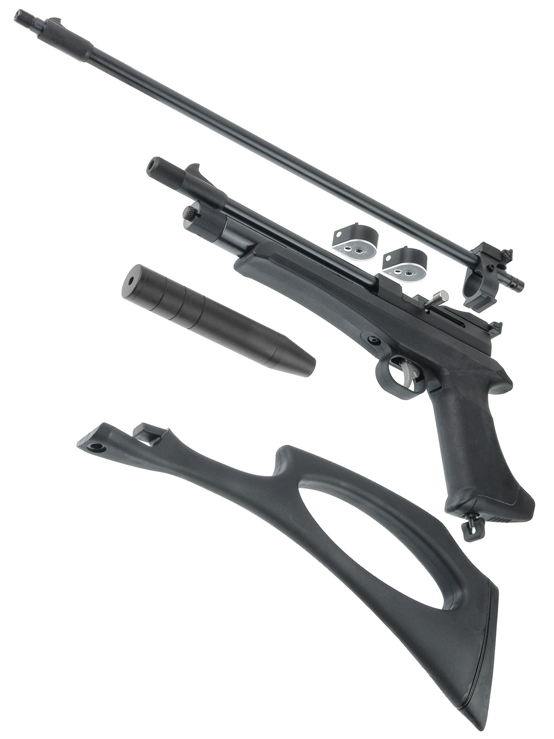 | Комплектация (?): | пистолет, сменный ствол 450 мм, съёмная ложа, модератор, пулевой магазин – 2 шт., комплект запасных частей, инструкция |