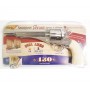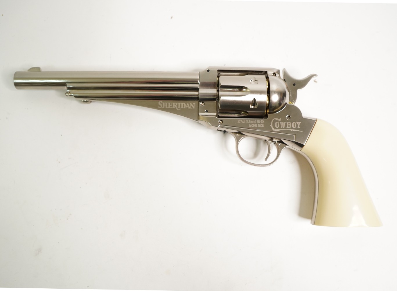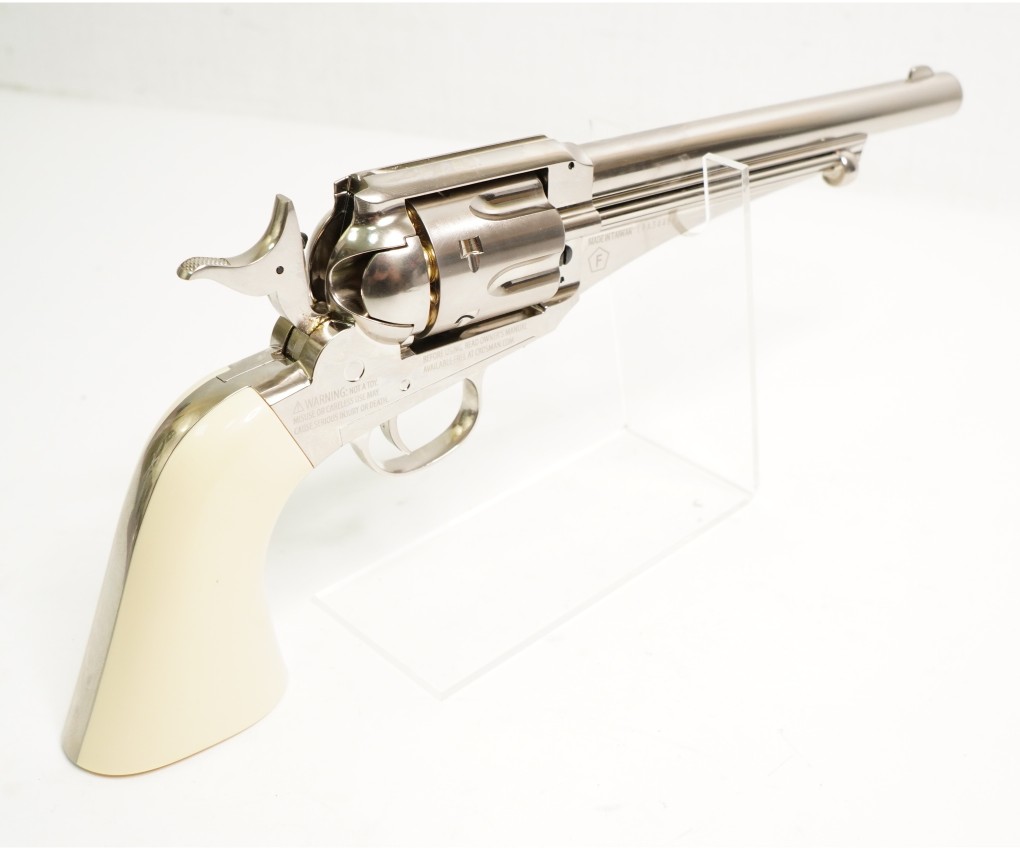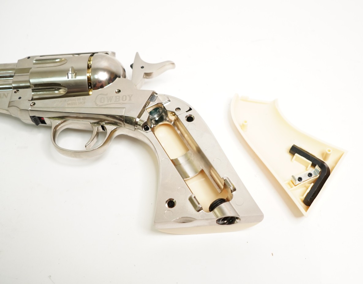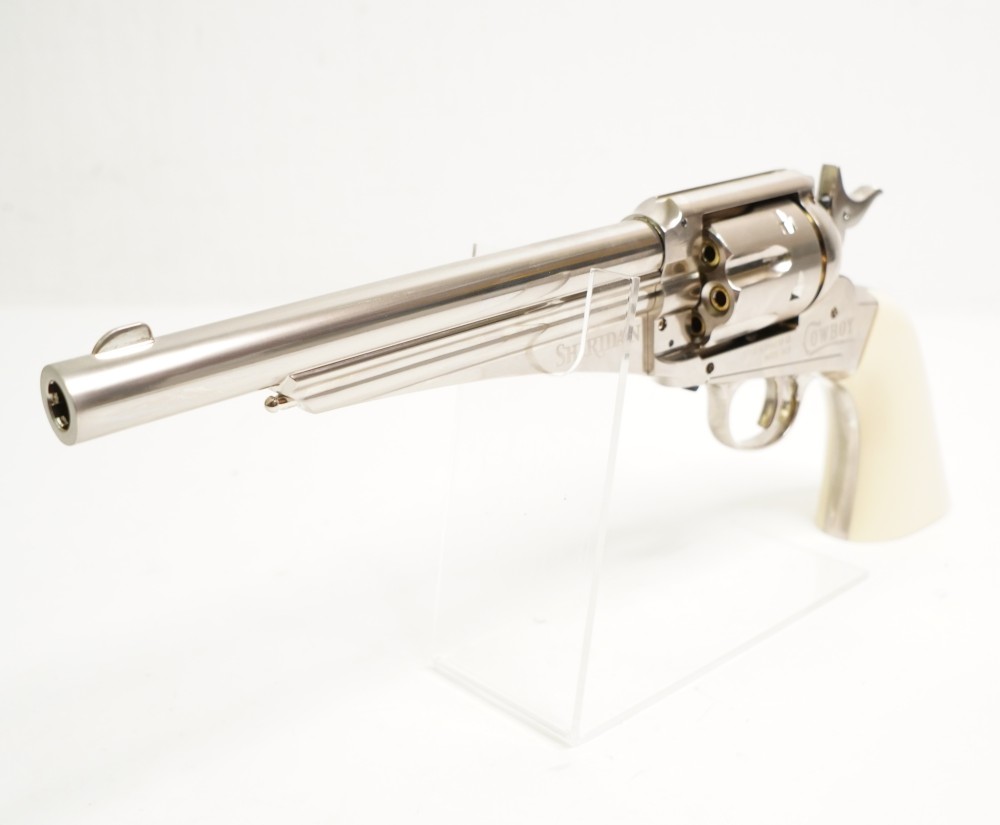 Пневматический револьвер Crosman Sheridan Cowboy – это оригинальная страйкбольная модификация на основе американского Remington 1875, красивое оружие от известного бренда. Эта модель является газобаллонной пневматикой, и нуждается в установке в полость рукоятки газового баллончика 12 г, там же находится и шестигранник.