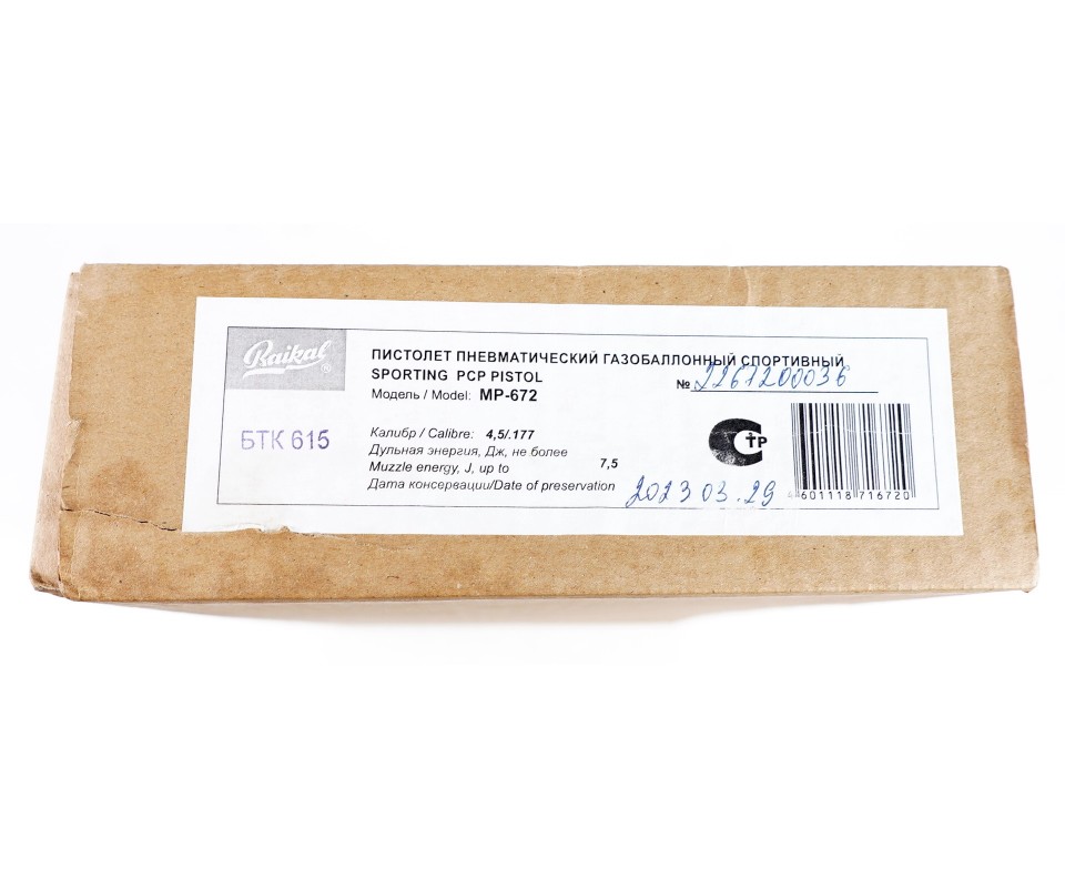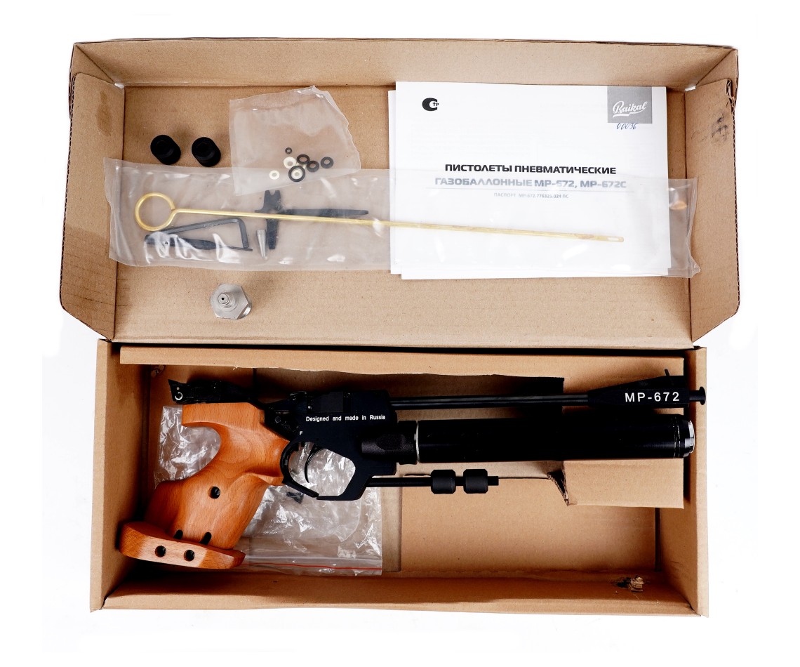 Общая длина пистолета МР 672 составляет 420 мм, при этом его масса составляет 1.3 кг. Рукоять изготовлена из древесины твердых пород, очень эргономична, что вполне ожидаемо для спортивного пистолета. Имеется регулируемый упор.