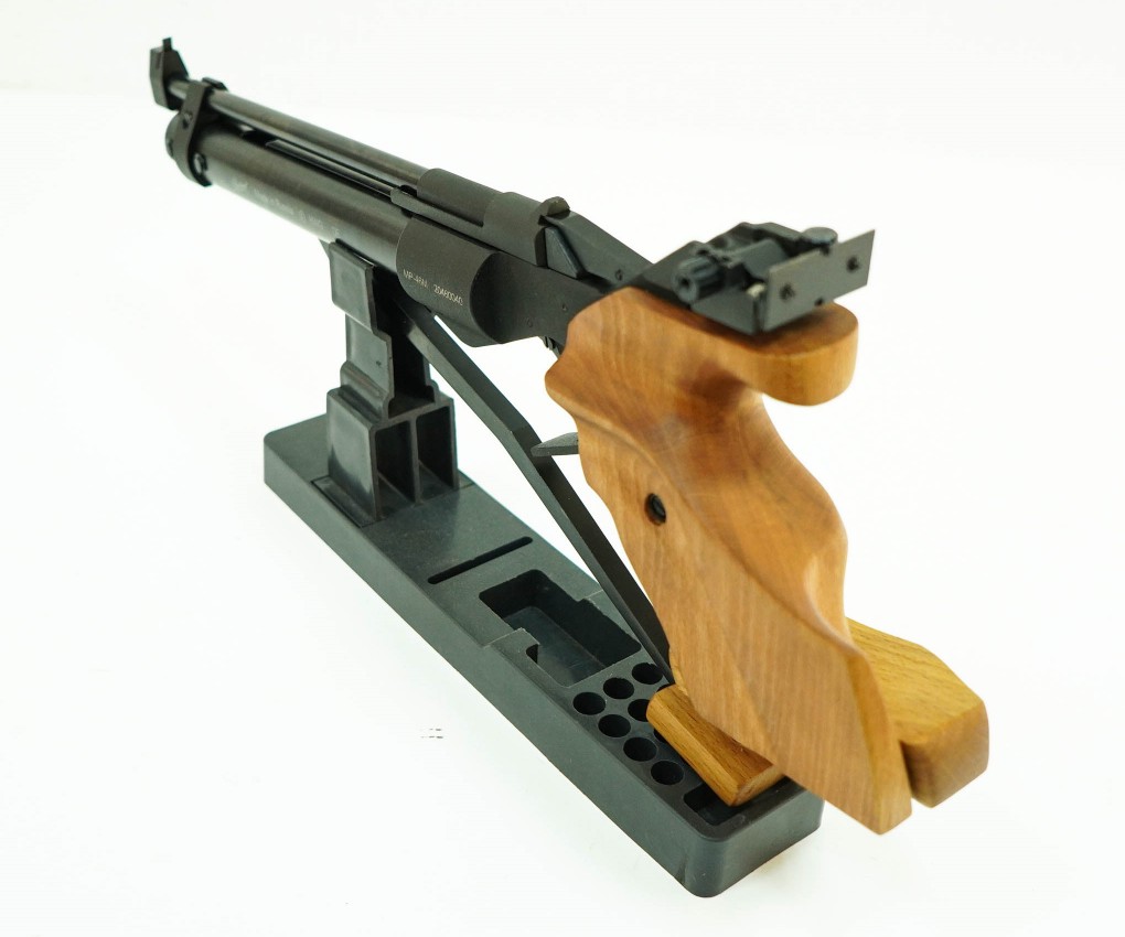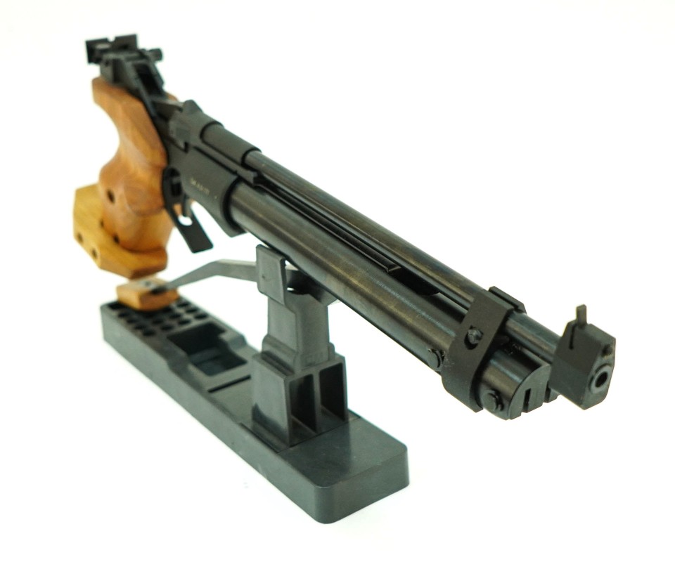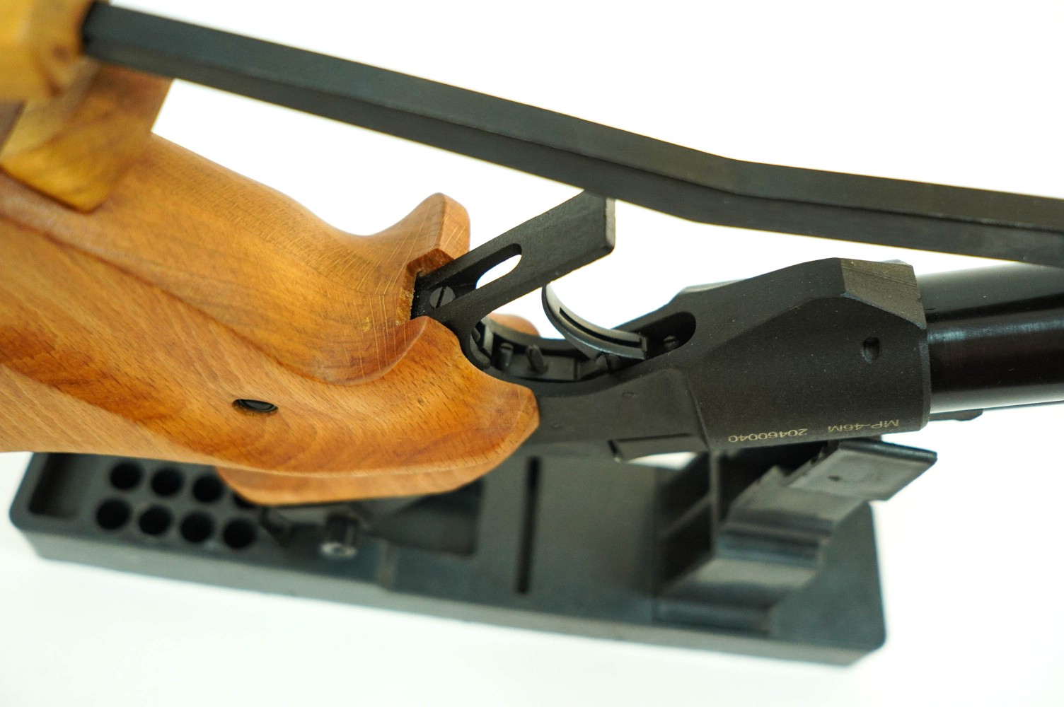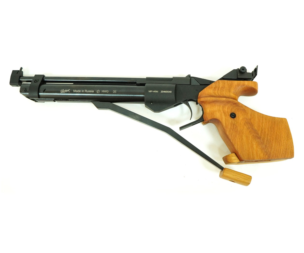 Пневматический спортивный пистолет МР-46М – это модификация мультикомпрессионного типа от Ижевского механического завода. Этот спортивный пистолет однозарядный, источником энергии здесь является воздух, закачанный в газовый резервуар при помощи специального подствольного рычага. Величина усилия взведения компрессора - 78,4 Н.
