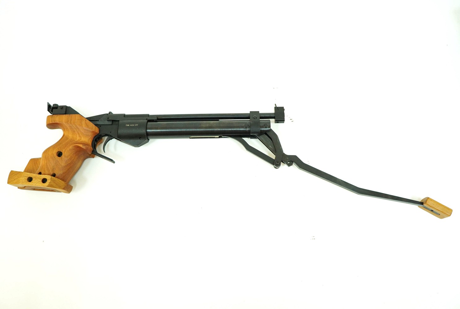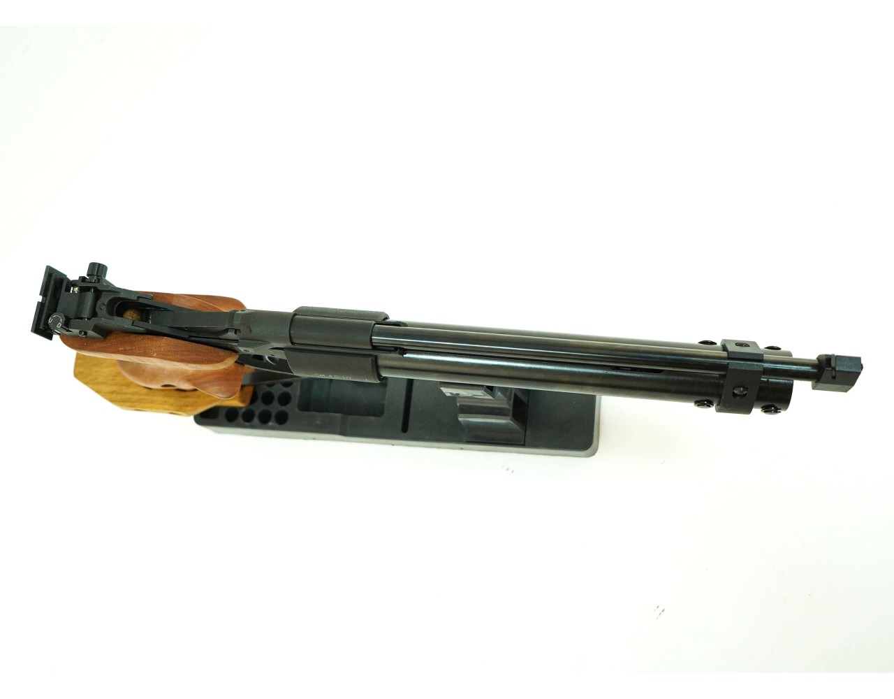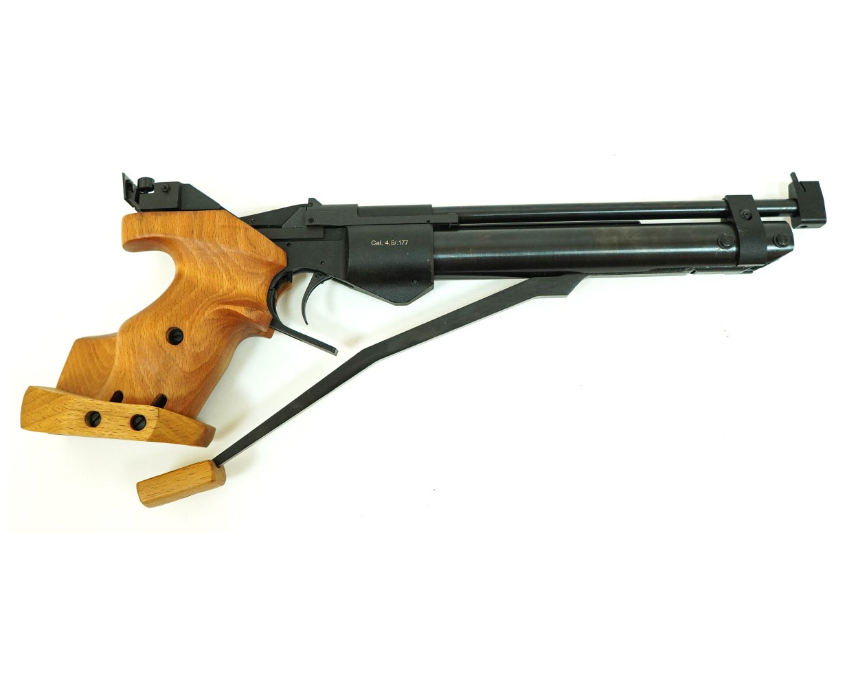 Пневматический спортивный пистолет МР-46М – это модификация мультикомпрессионного типа от Ижевского механического завода. Этот спортивный пистолет однозарядный, источником энергии здесь является воздух, закачанный в газовый резервуар при помощи специального подствольного рычага. Величина усилия взведения компрессора - 78,4 Н.