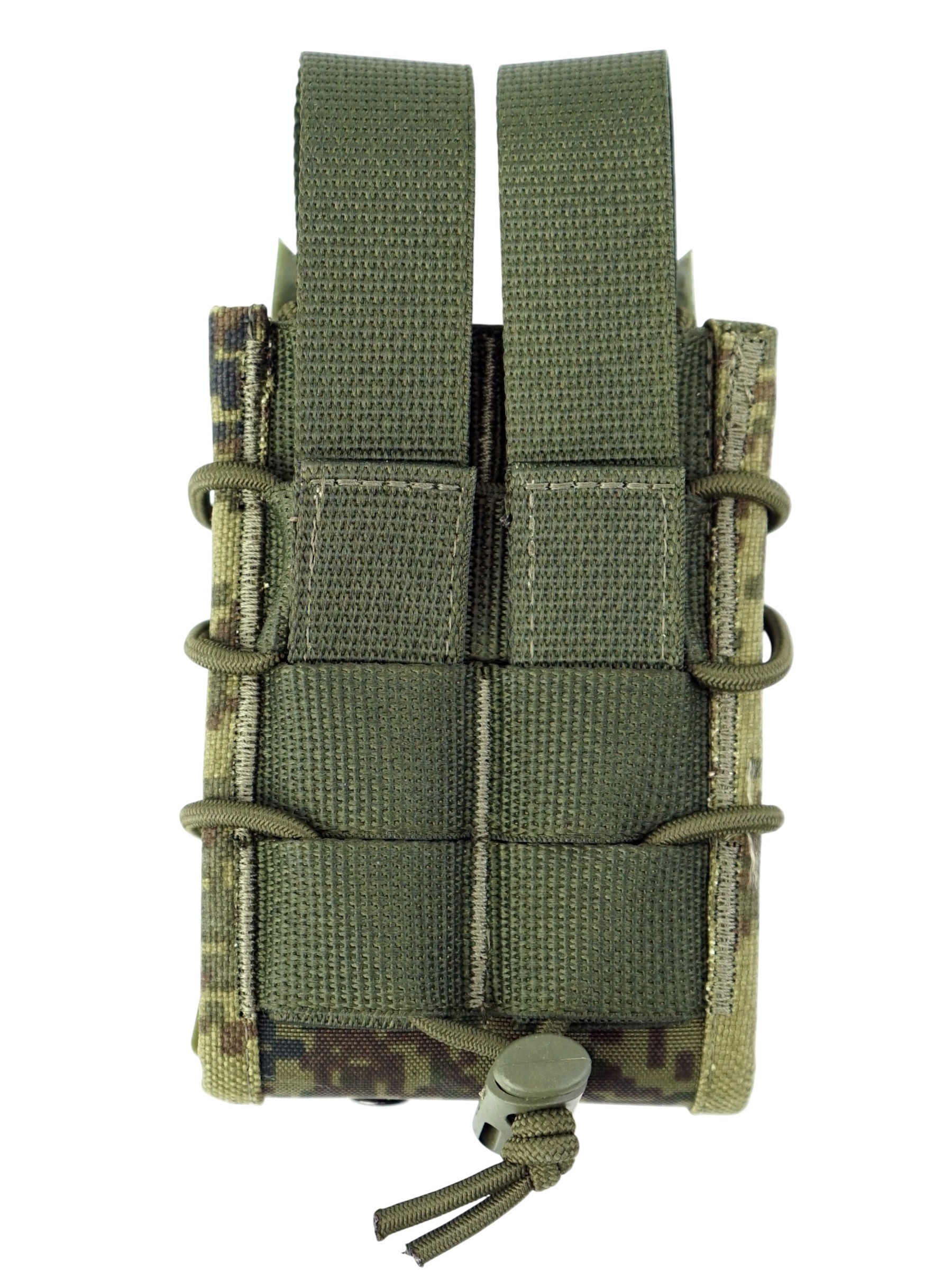 На задней стенки подсумка вшитые стропы системы крепления MOLLE, которые позволяют разместить подсумок на любом тактическом снаряжении, на различных бронежилетах, так же на боевых поясах (варбелтах).