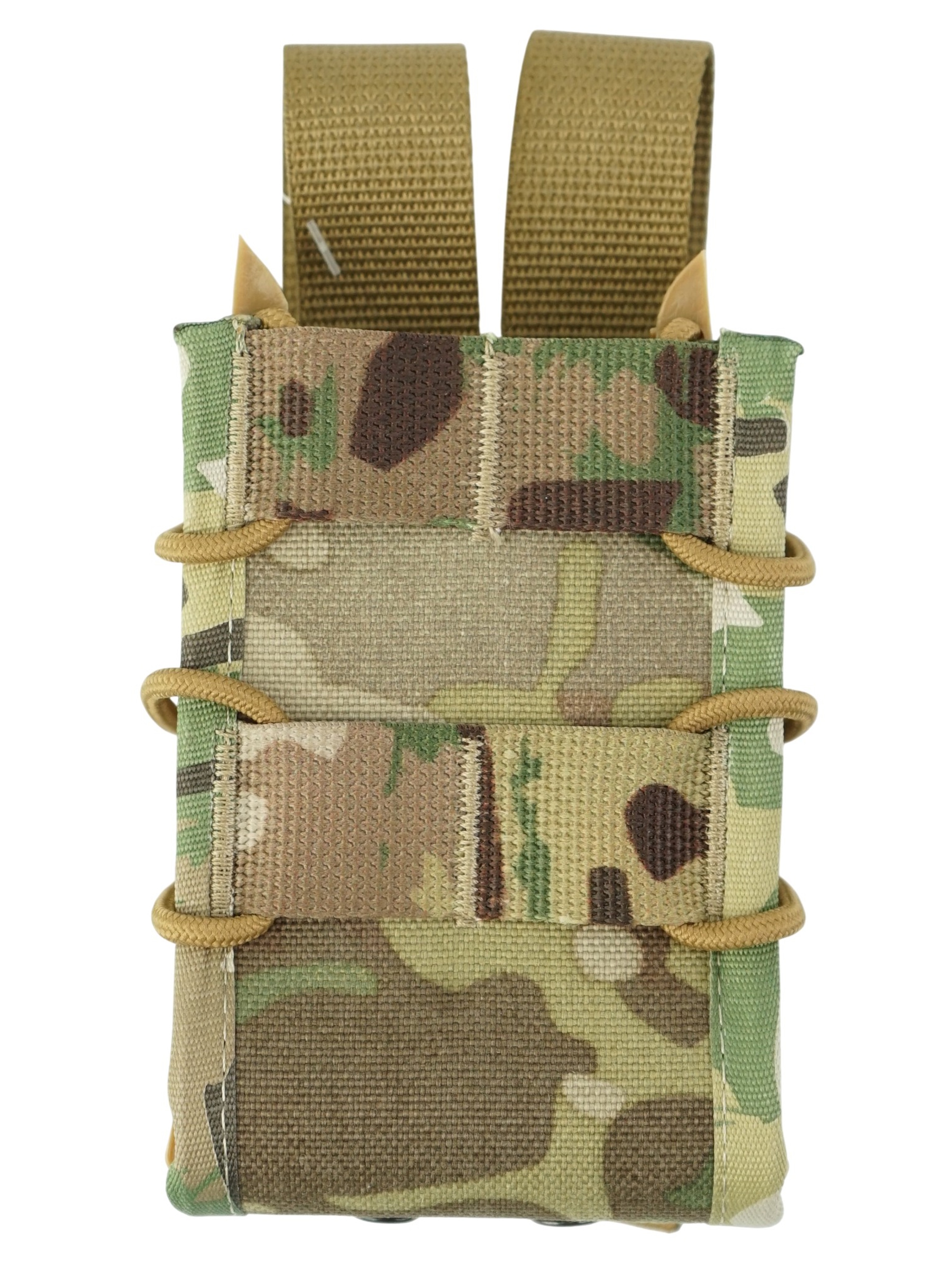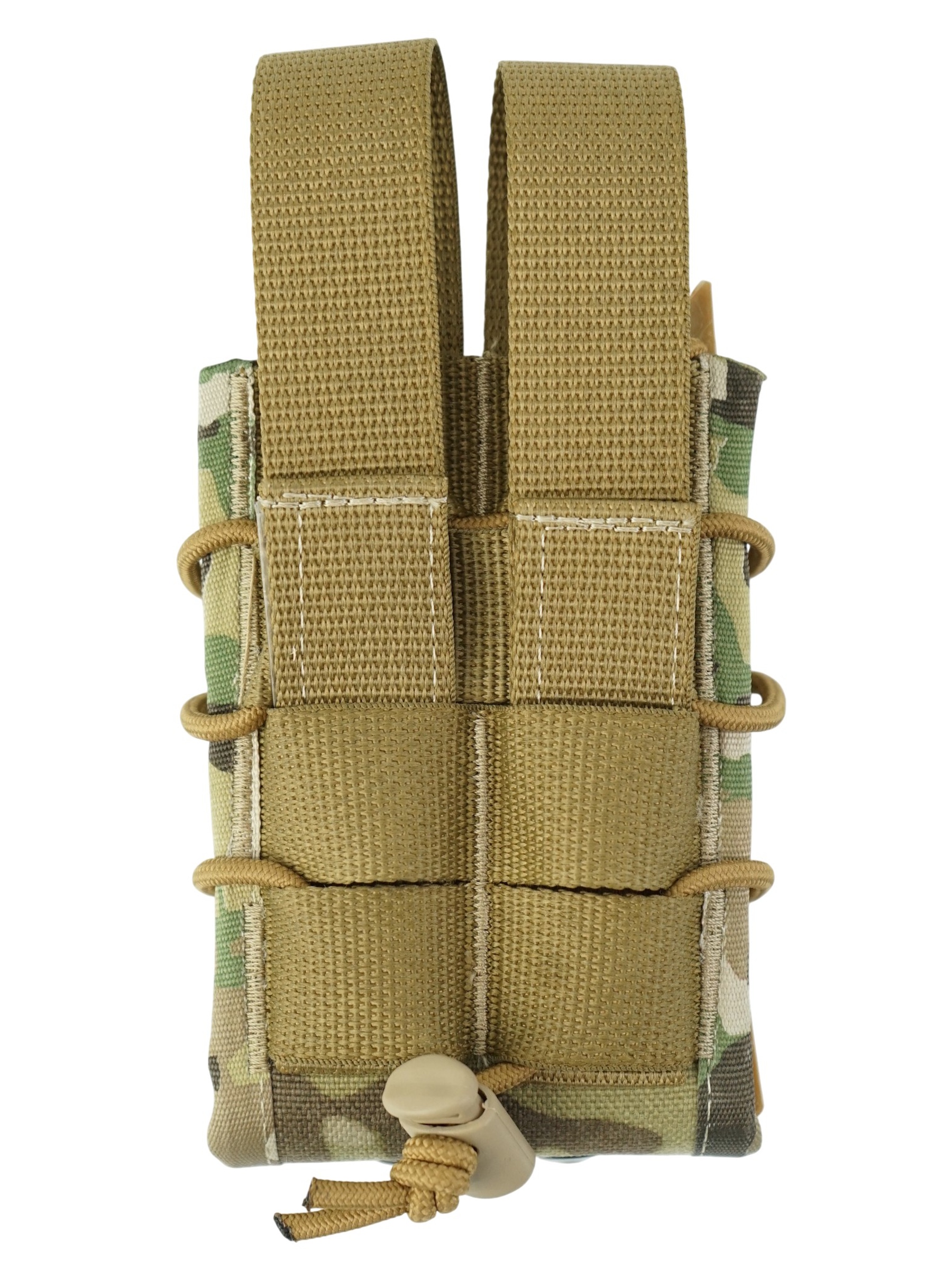 На задней стенки подсумка вшитые стропы системы крепления MOLLE, которые позволяют разместить подсумок на любом тактическом снаряжении, на различных бронежилетах, так же на боевых поясах (варбелтах).