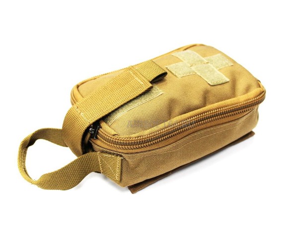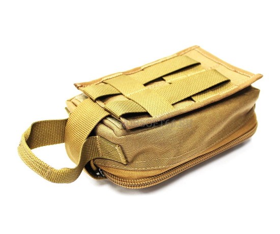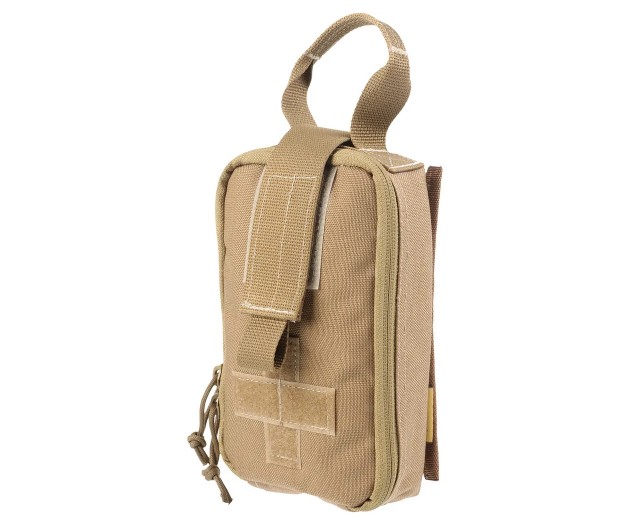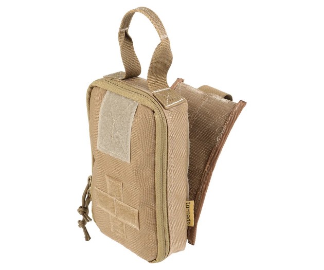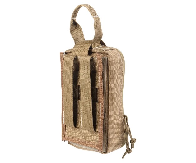 Отрывная аптечка среднего размера для размещения медикаментов и перевязочного материала для оказания первой помощи в полевых условиях. Подсумок с медикаментами при помощи липучки велкро крепится на платформе и страхуется хлястиком. Если отстегнуть хлястик, то резко потянув за ручку, подсумок можно сорвать с платформы и либо передать партнеру, либо начать использовать самому.