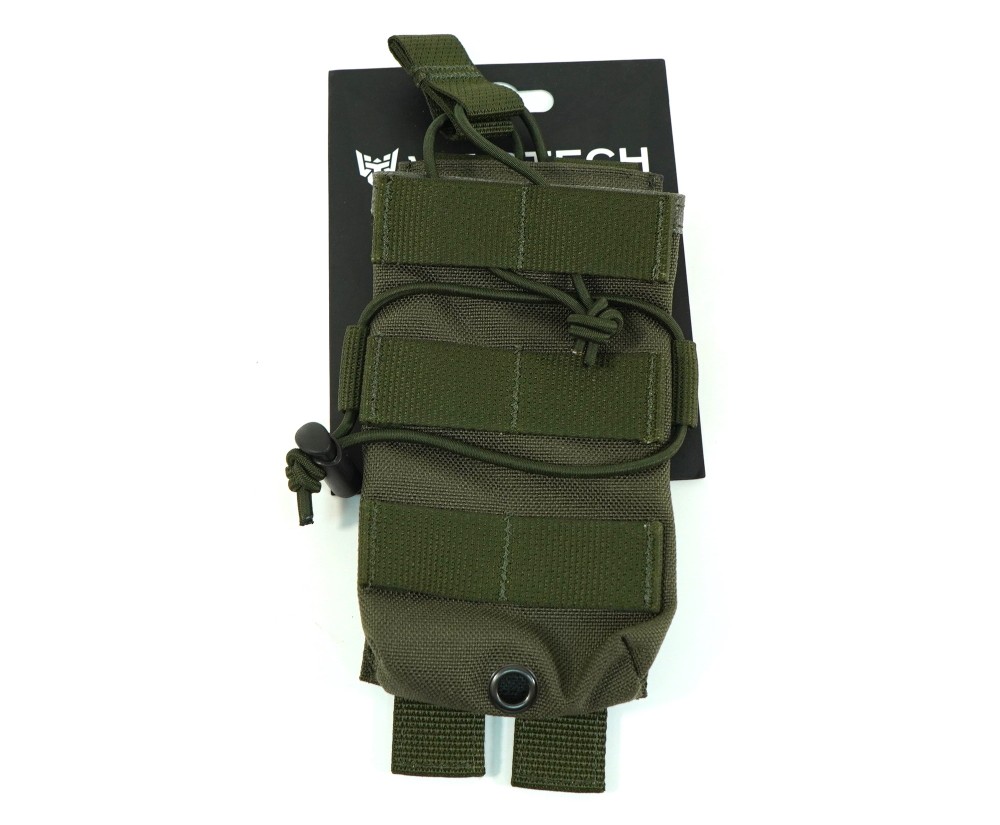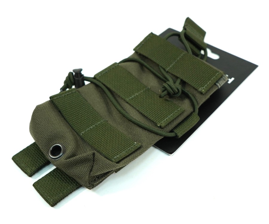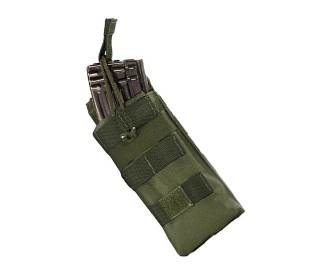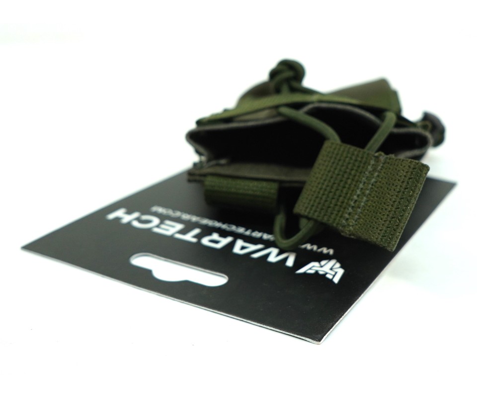 Магазин фиксируется с помощью резинки с хлястиком, что обеспечивает быстрое извлечение и защищает от утери. Так же возможно размещение на обычном ремне. Доступен в различных цветах, данный вариант в цвете олива.