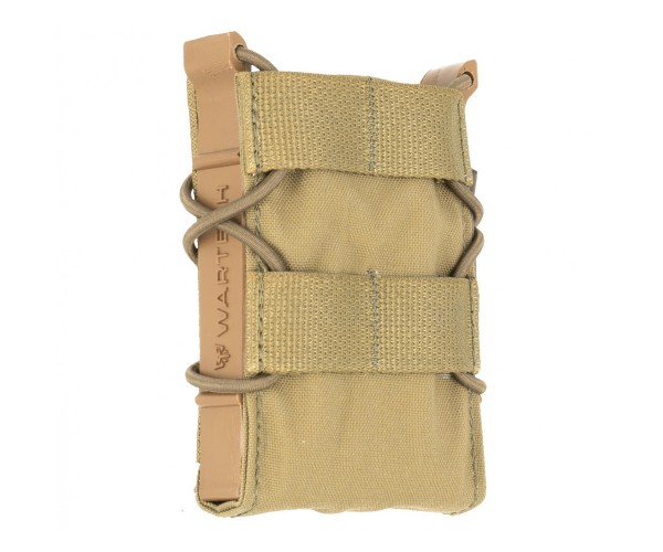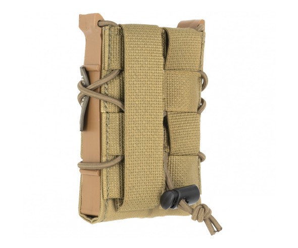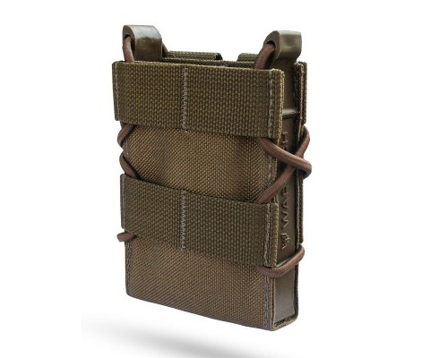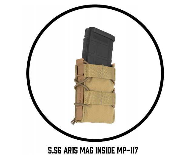 Оснащен внешними стропами MOLLE и позволяет разместить на нем дополнительное снаряжение. Имеет компактный размер. Объем подсумка настраивается с помощью резинки которая регулирует степень сжатия пластиковой вставки, что надежно защищает магазин от утери. Возможно размещение на обычном ремне. Доступен в различных цветах, данный вариант в цвете койот.