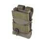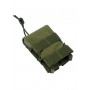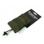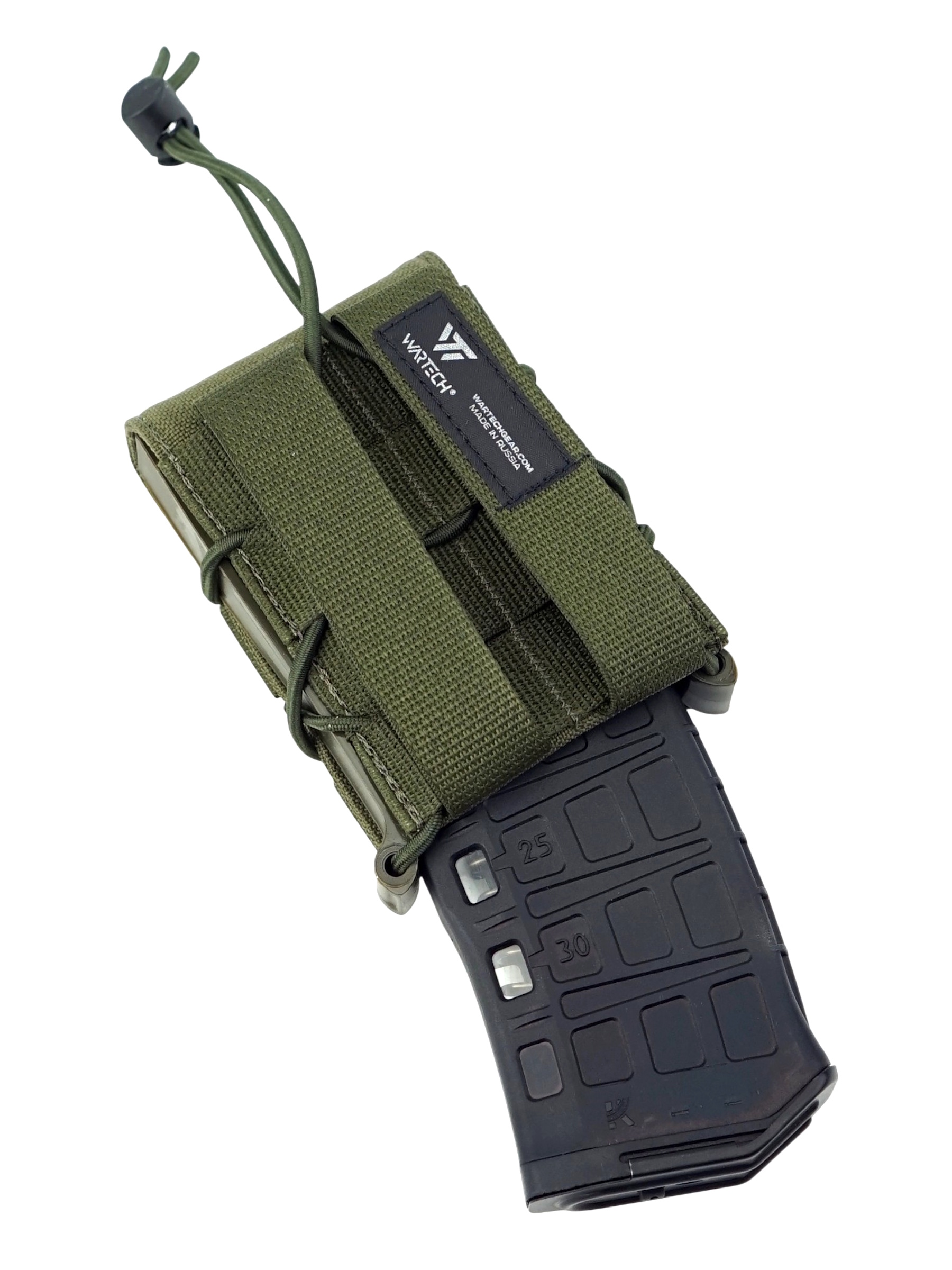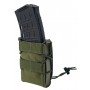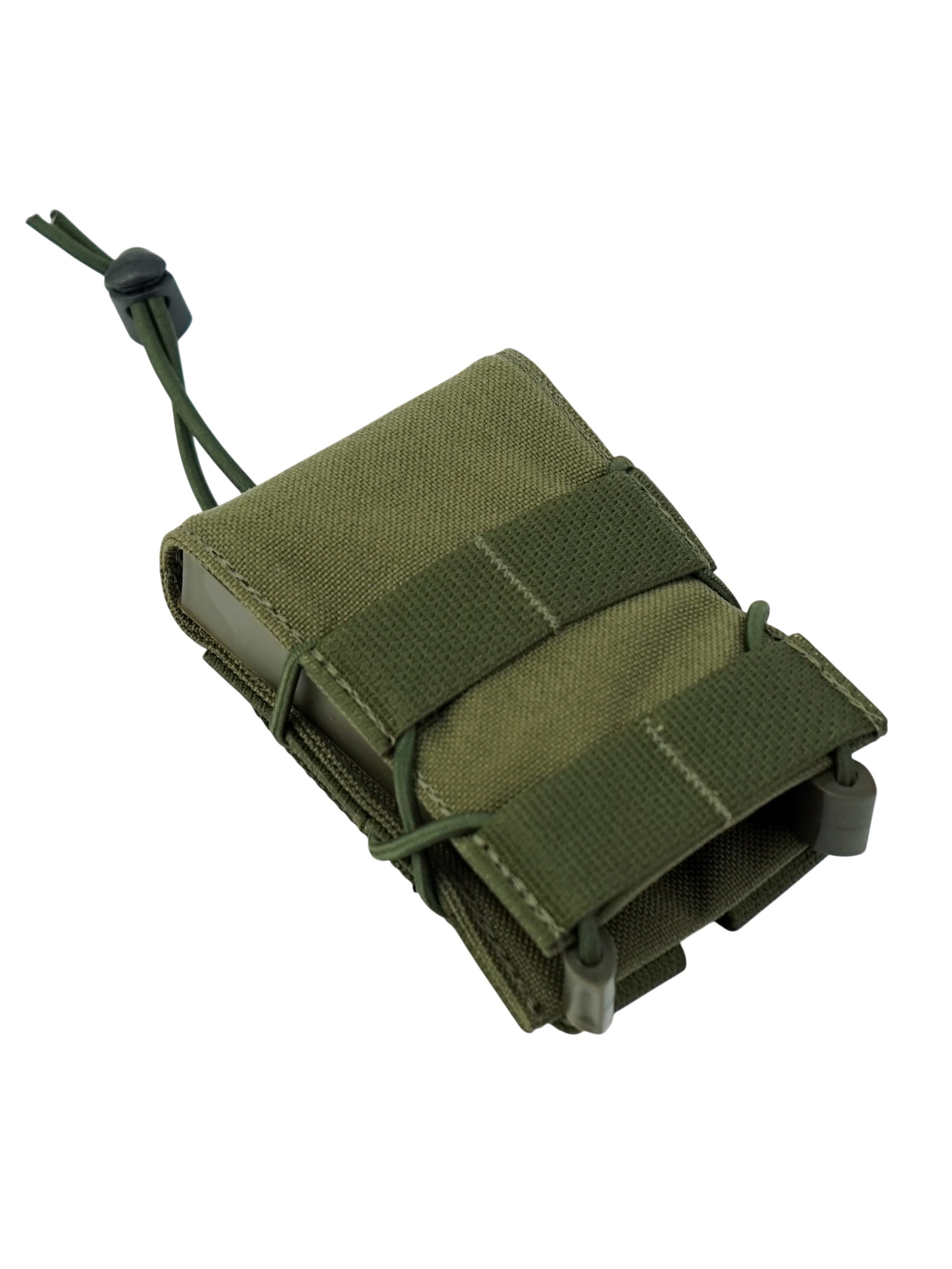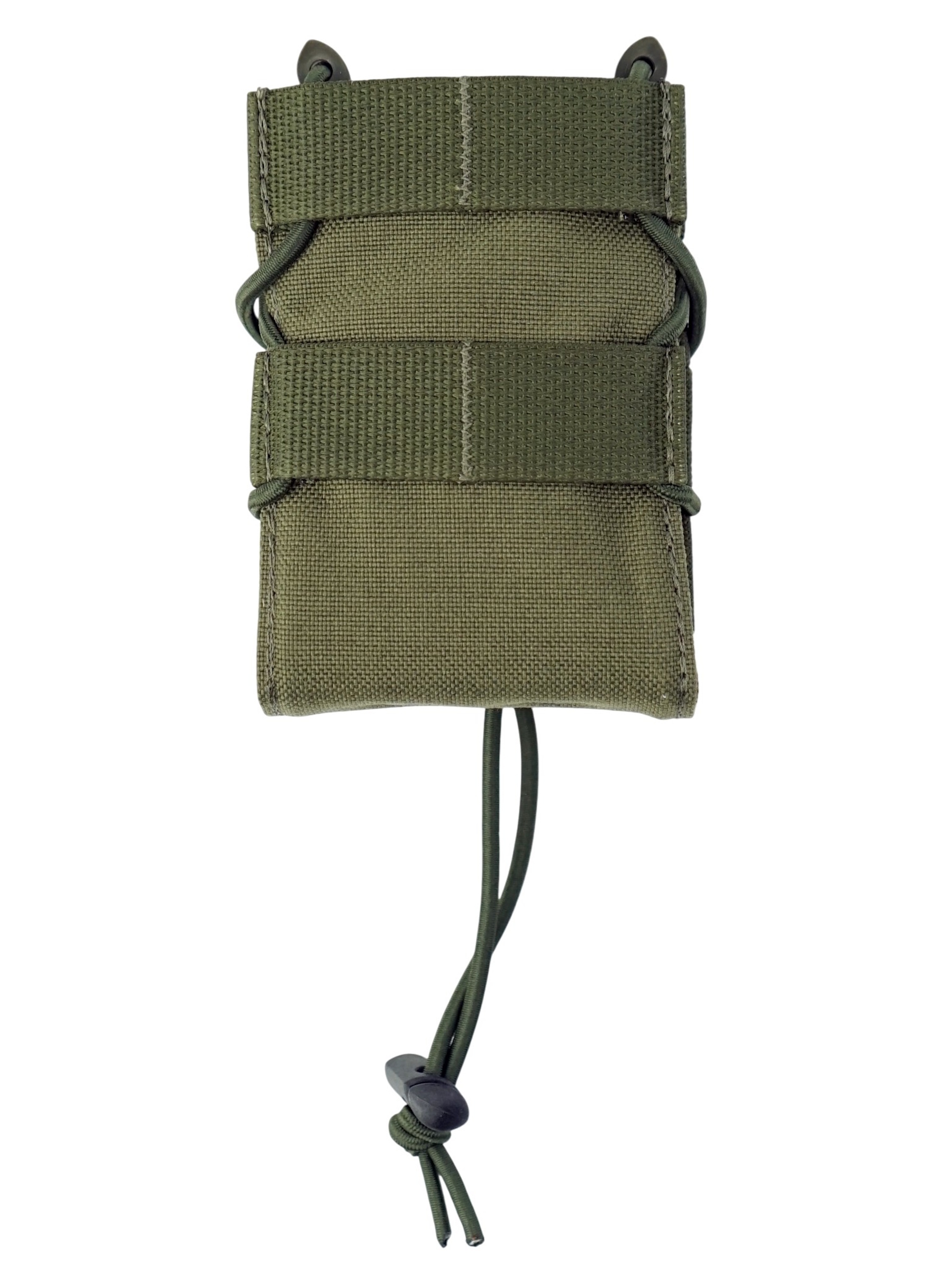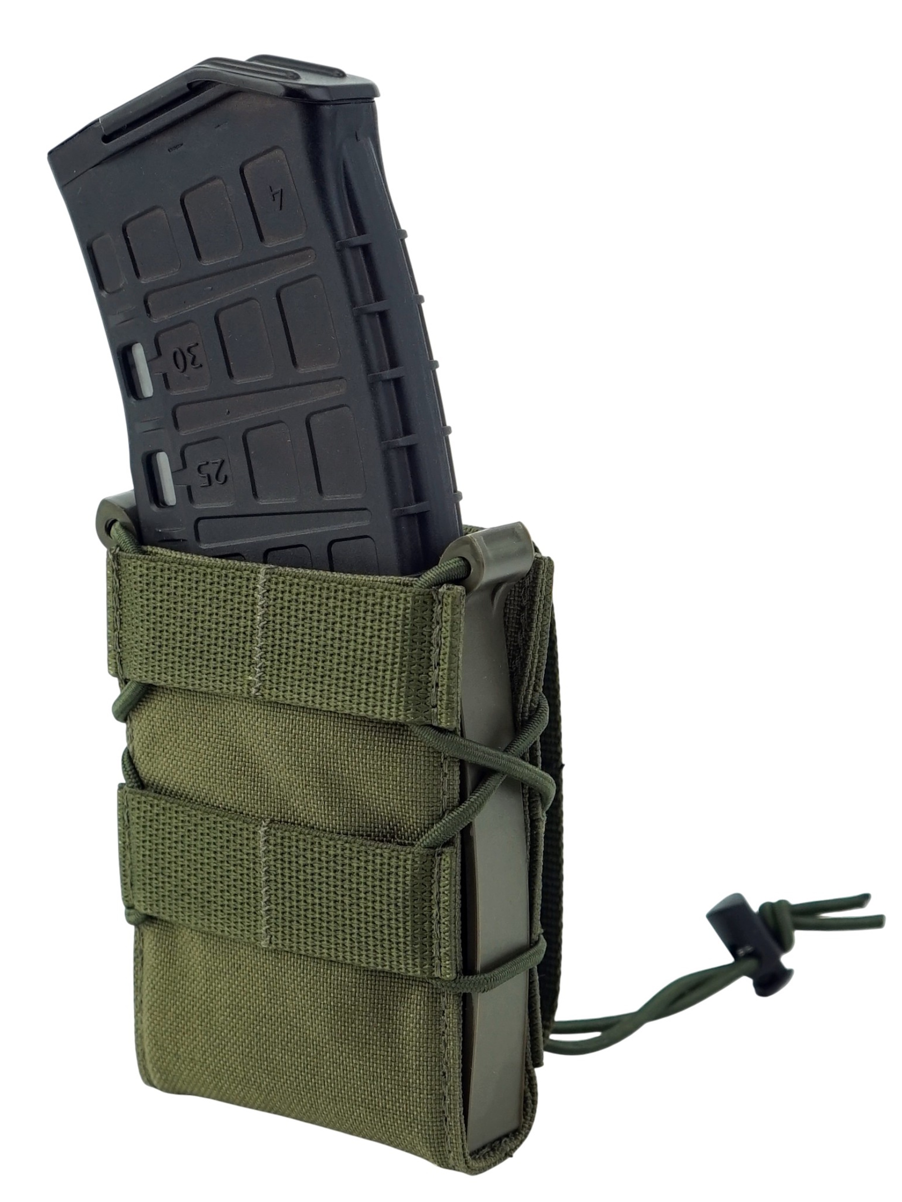 Оснащен внешними стропами MOLLE и позволяет разместить на нем дополнительное снаряжение. Имеет компактный размер. Объем подсумка настраивается с помощью резинки которая регулирует степень сжатия пластиковой вставки, что надежно защищает магазин от утери. Возможно размещение на обычном ремне. Доступен в различных цветах, данный вариант в цвете олива.