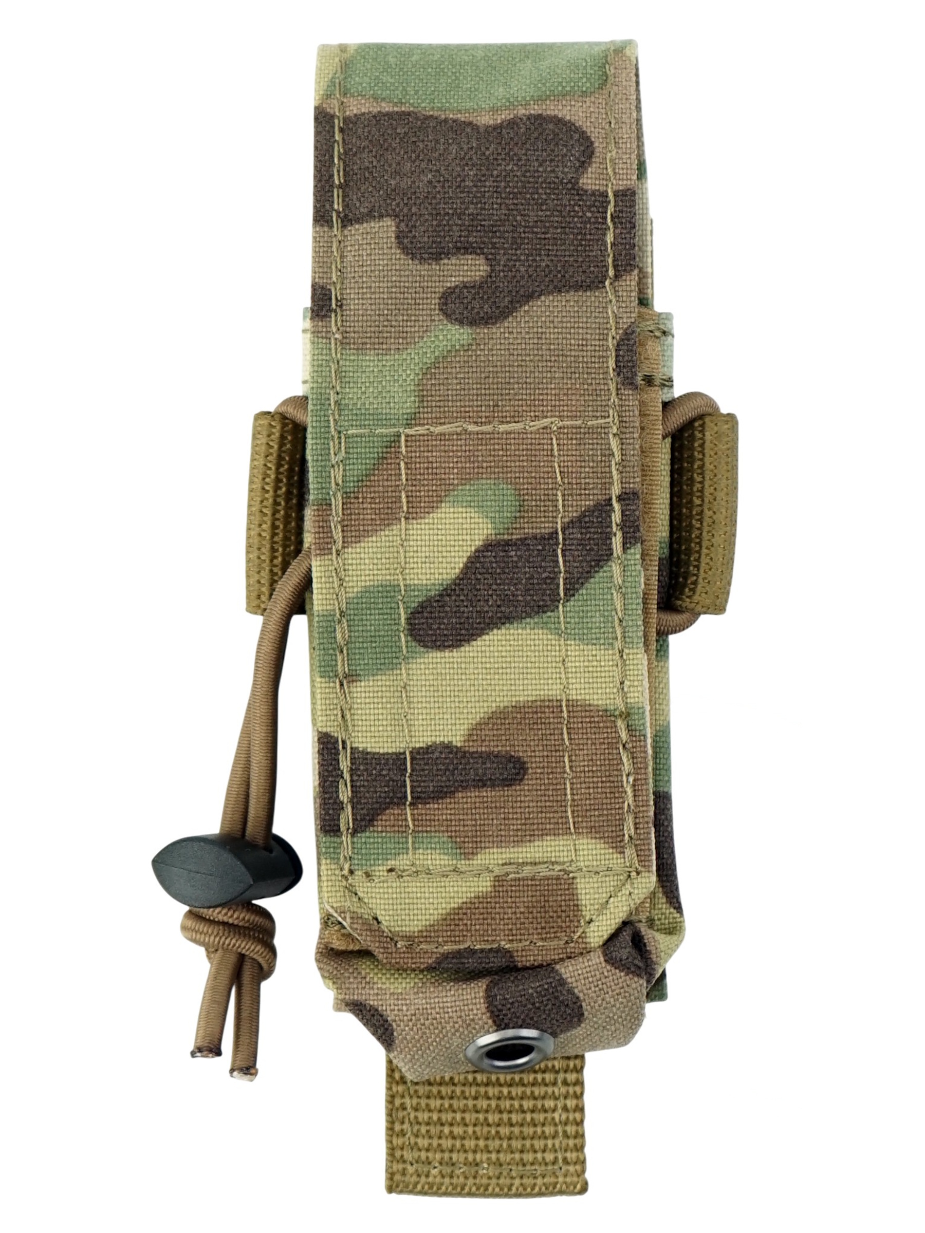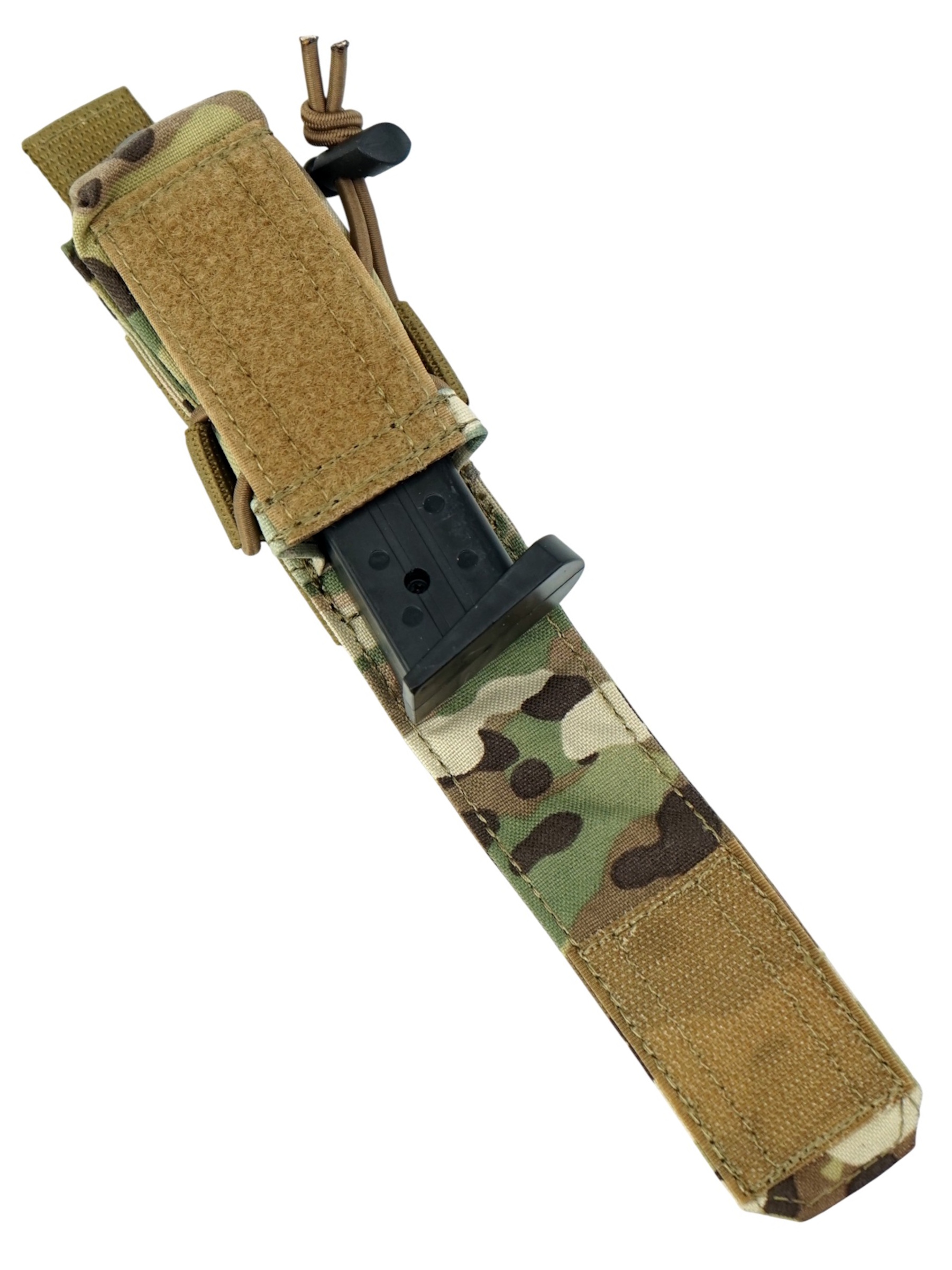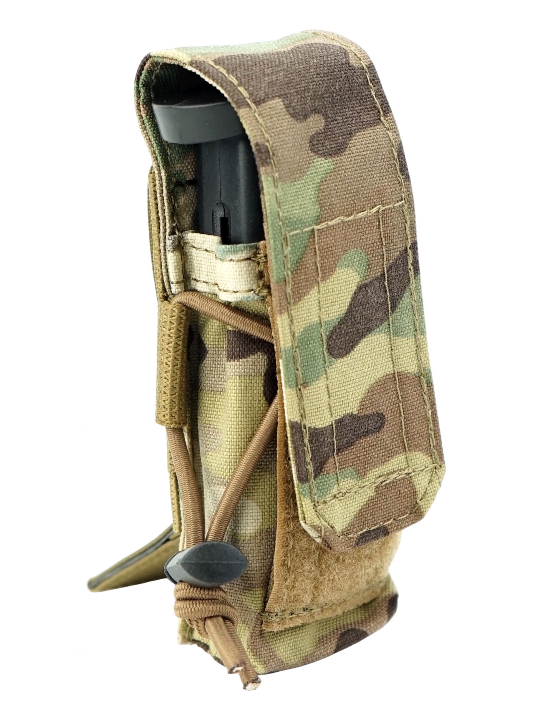 Объем подсумка настраивается с помощью резинки которая так же удерживает магазин если клапан заправлен и подсумок используется как открытый. Закрывается на клапан с липучкой, что надежно защищает магазин от утери. Возможно размещение на обычном ремне. Доступен в различных цветах, данный вариант в цвете multicam.