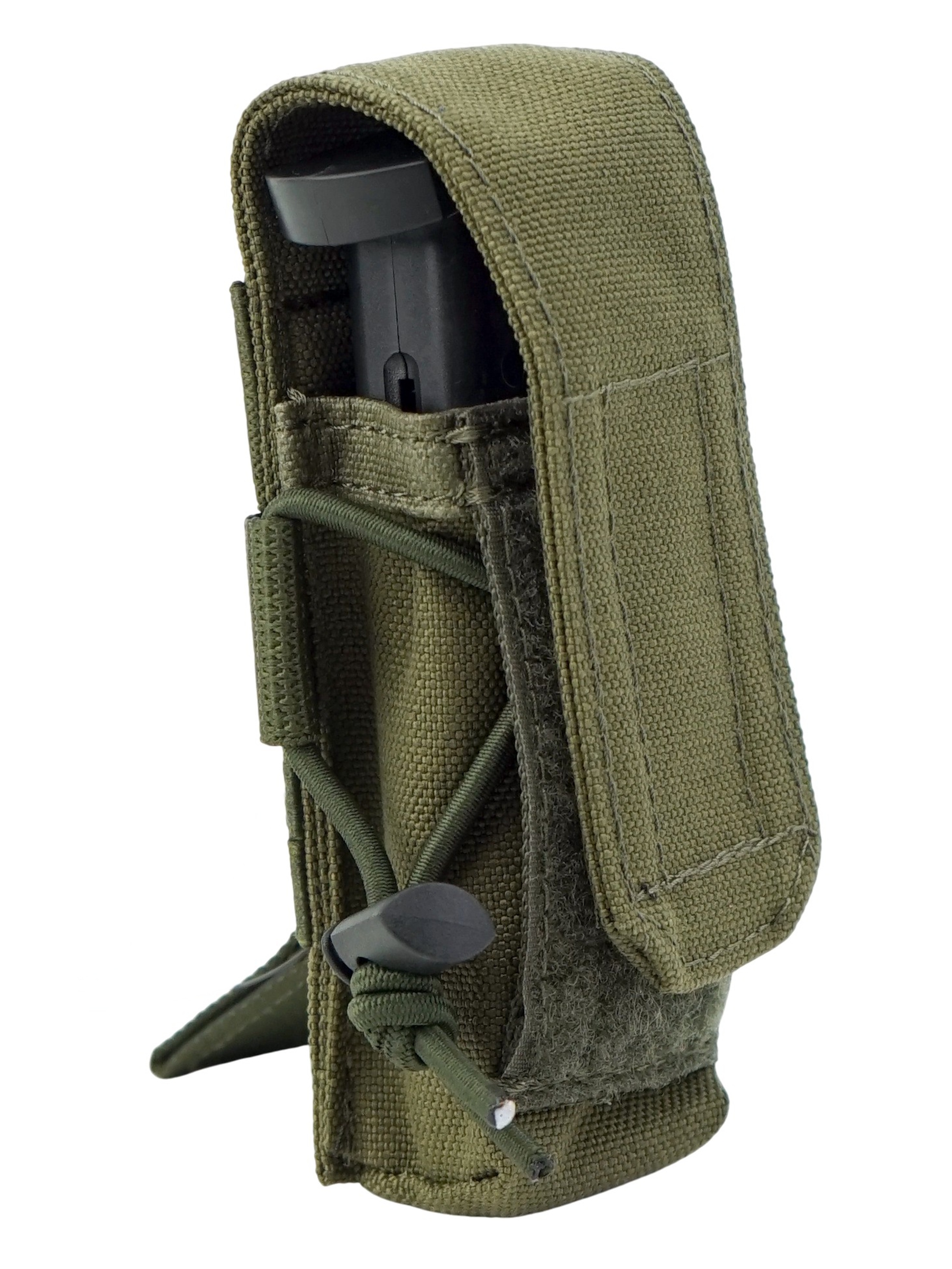 Объем подсумка настраивается с помощью резинки которая так же удерживает магазин если клапан заправлен и подсумок используется как открытый. Закрывается на клапан с липучкой, что надежно защищает магазин от утери. Возможно размещение на обычном ремне. Доступен в различных цветах, данный вариант в цвете олива.