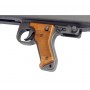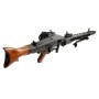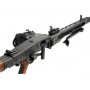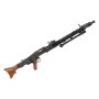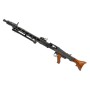 Корпус страйкбольного пулемета марки G&G GMG42 140-150 m/s изготавливался из стали с применением деревянной фурнитуры. Внешний ствол можно легко зафиксировать специальной клавишей, к тому же он быстросъемный. Оружие может быть использовано только в режиме "автоматический". Схема крепления скопирована с оригинального пулемета. В комплекте поставляется бункер, предназначенный для питания от съемного аккумулятора. Имеется и встроенный, который располагается внутри привода.