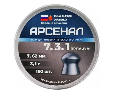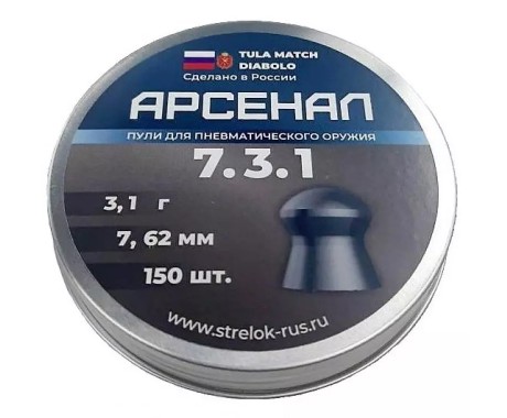 Пули Арсенал для пневматики калибра 7,62 мм — это тяжелые пустотелые свинцовые пули типа Diabolo от отечественного производителя. Пули в количестве 150 штук средним весом 3,1 грамм.