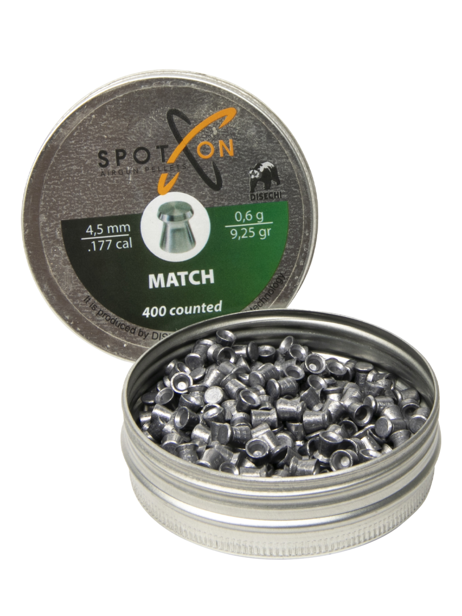 Пули SPOTON Match - высокоточные пули с плоской головной частью калибра 4,5 мм для средних дистанций. В упаковке 400 штук средним весом 0,6 грамм.
