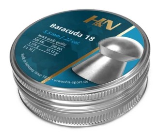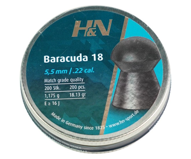 Пули H&N Baracuda 18 для пневматики калибра 5,5 мм — новые тяжелые охотничьи пули с полусферической головной частью, для дальних дистанций. Первоклассный аэродинамический дизайн для высокой пробиваемости и проникающей способности. Высокая кучность. Минимальное освинцовывание и равномерное распределение попаданий благодаря специальному сплаву. Поверхность гладкая. Пули в количестве 200 штук средним весом 1,175 грамм.