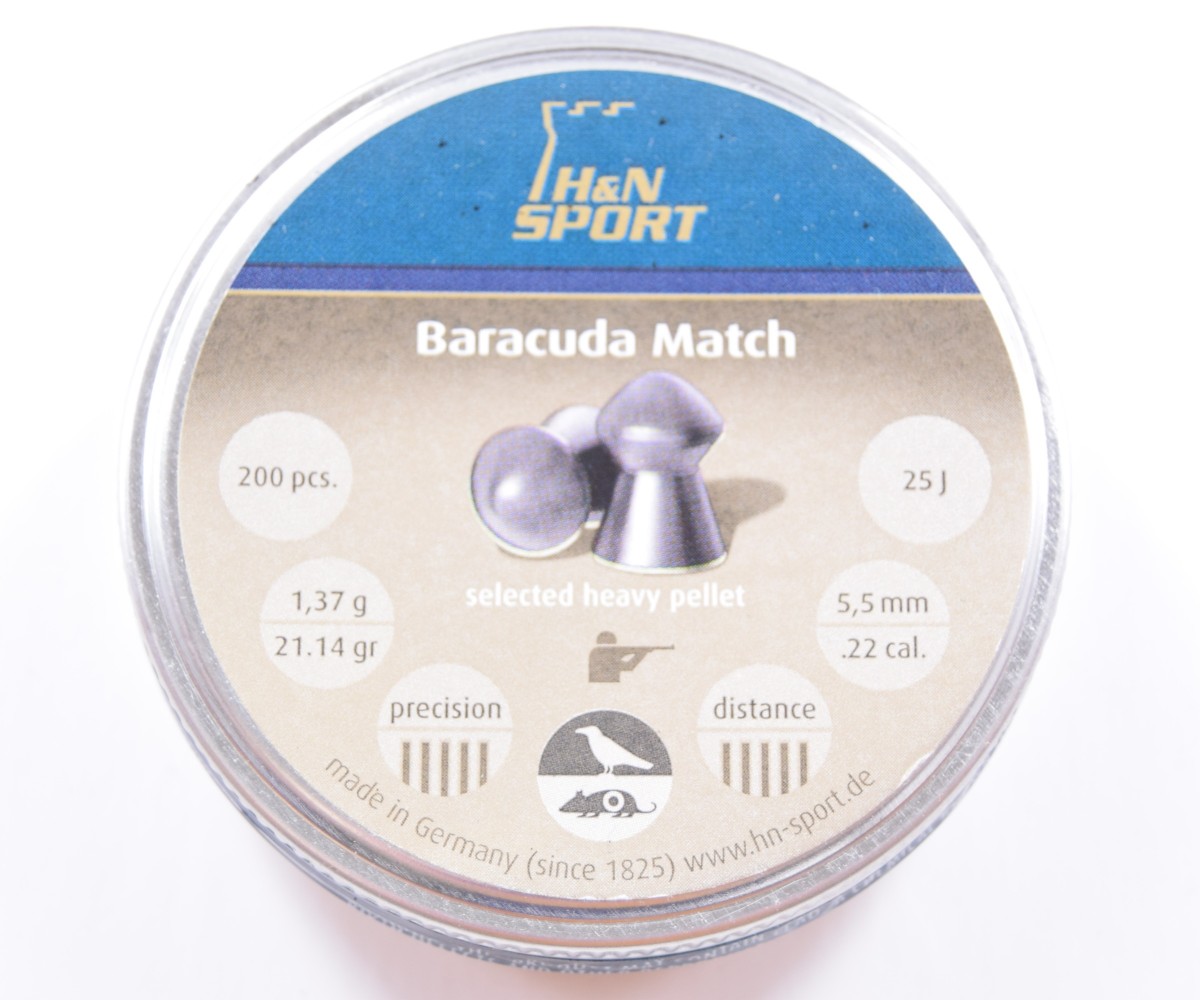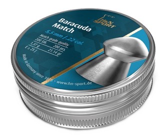 Пули H&N Baracuda Match для пневматики калибра 5,5 мм — тяжелые высокоточные пули с полусферической головной частью, для дальних дистанций. Первоклассный аэродинамический дизайн для высокой пробиваемости и проникающей способности. Очень высокая кучность. Минимальное освинцовывание и равномерное распределение попаданий благодаря специальному сплаву. Специальная сортировка. Имеющиеся диаметры головной части: 5,51–5,53. Поверхность гладкая. Пули в количестве 200 штук средним весом 1,37 грамм.