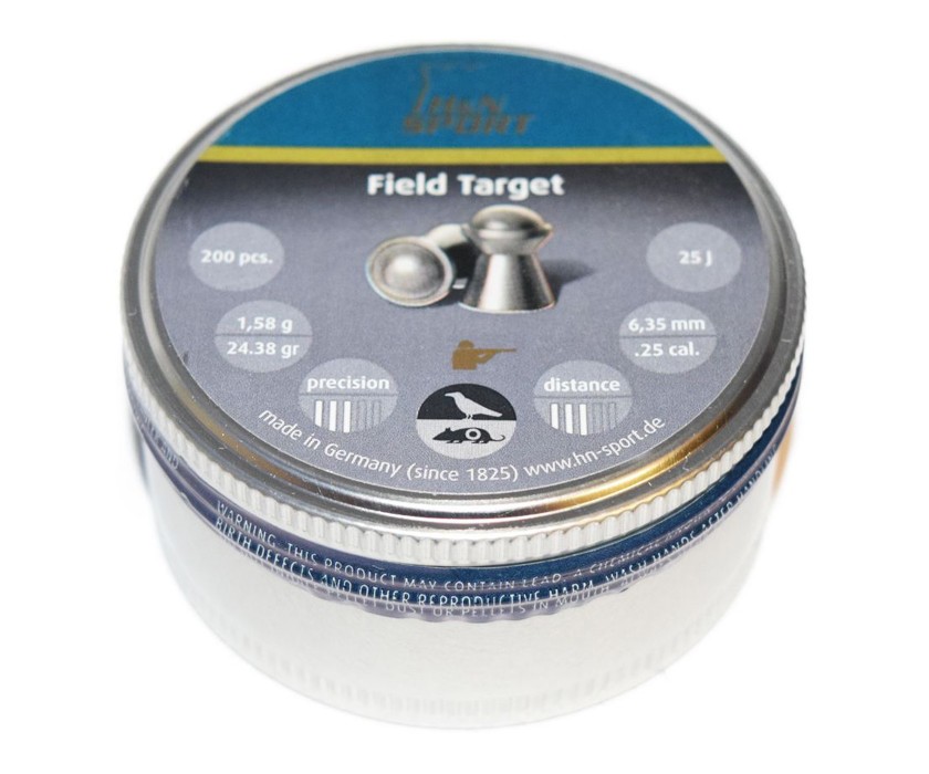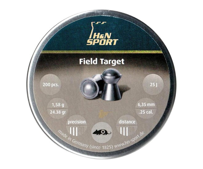 Пули H&N Field Target для пневматики калибра 6,35 мм — высокоточные пули средней тяжести с полусферической головной частью, с настильной траекторией полета для средних дистанций. Необычный аэродинамический дизайн для высокой проникающей способности и пробиваемости. Четкие края пробоин и высокая кучность. Наилучшим образом пригодна для стрельбы по мишеням, в том числе и по падающим мишеням. Поверхность гладкая с отштампованным пояском. Пули в количестве 200 штук средним весом 1,58 грамм.