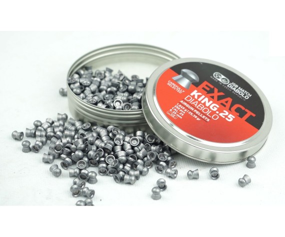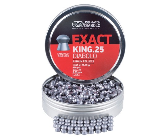 Пули JSB Exact King для пневматики калибра 6,35 мм — это тяжелые свинцовые пули с полусферической головной частью от чешского производителя JSB. Отлично подходят для охоты на большие дистанции. Обладают хорошей проникающей способностью и большой убойной силой. Пули в количестве 350 штук средним весом 1,645 грамм.