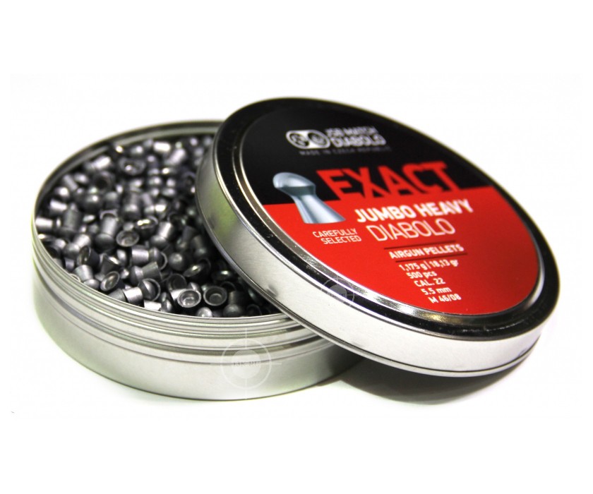 Пули JSB Exact Jumbo Heavy для пневматики калибра 5,5 мм — это тяжелые свинцовые пули с полусферической головной частью от чешского производителя JSB. Подходят для спортивной стрельбы и охоты на большие дистанции. Благодаря своей форме обладают повышенной экспансивностью и большой пробивающей способностью. Пули в количестве 500 штук средним весом 1,175 грамм.