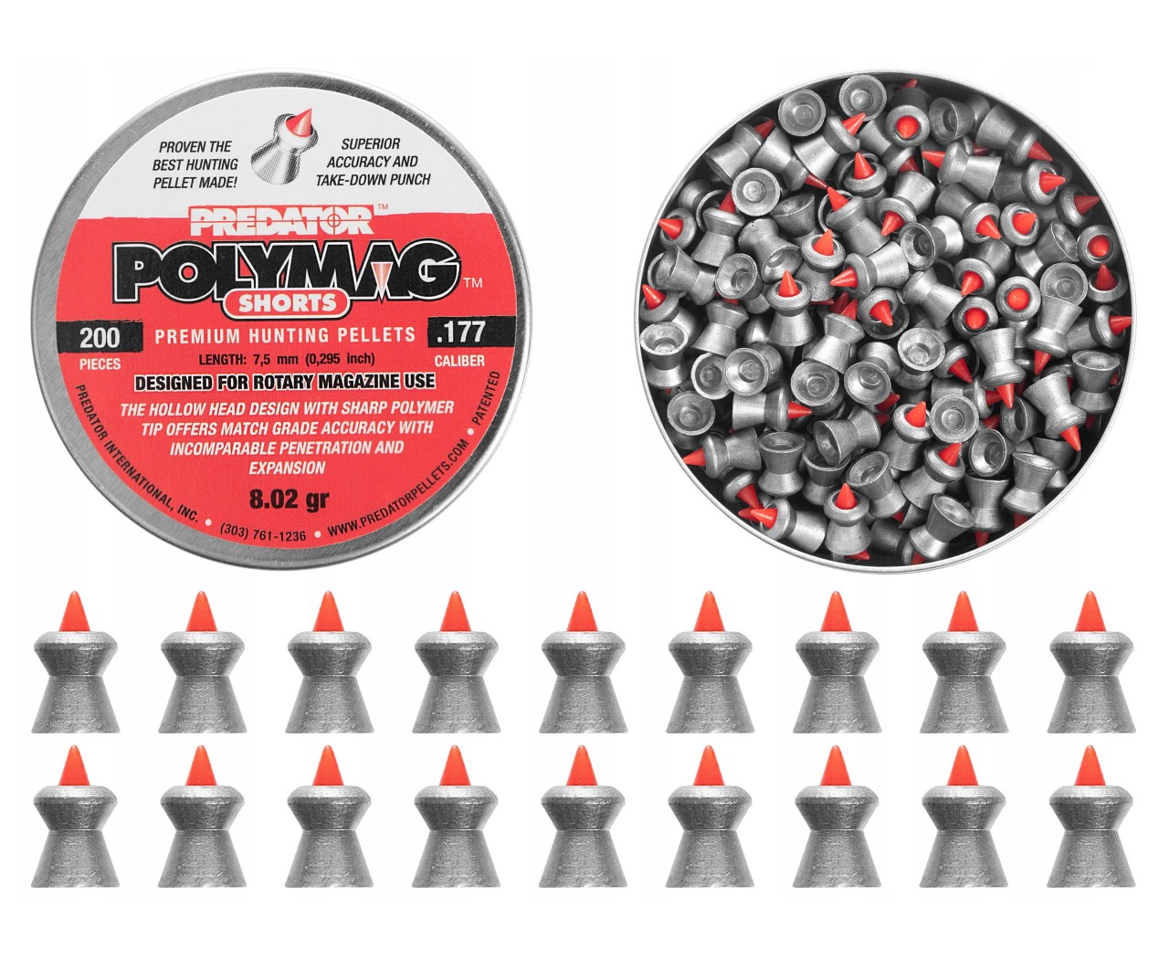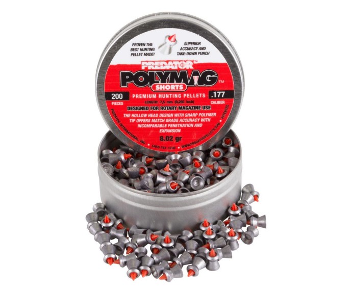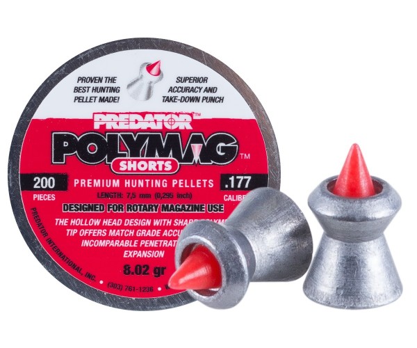 Пули JSB Predator Polymag Shorts калибра 4,5 мм - экспансивные, с пластиковым (полимерным) проникающим сердечником, для пневматических винтовок и пистолетов. Мягкие свинцовые пули высокого качества, средний вес 0,52 грамма. Разработаны специально для наиболее эффективного и действенного использования пневматических боеприпасов для охоты. В баночке 200 штук. Обладают высокой стабильностью полета, хороший выбор для спортивной стрельбы и охоты на большие дистанции.