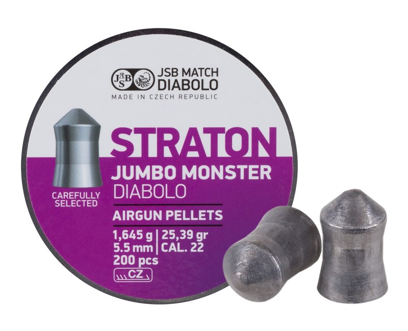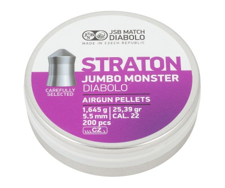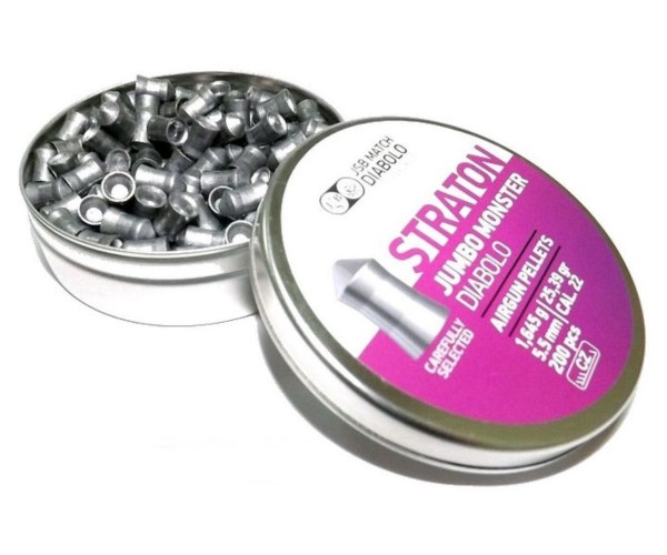 Пули JSB Straton Jumbo Monster для пневматики калибра 5,5 мм — это тяжелые свинцовые пули с заостренной головной частью от чешского производителя JSB. Данная конструкция головки обеспечивает максимальную проникающую способность снаряда. Оптимально подходят для стрельбы и охоты на большое расстояние, обладают высокой стабильностью полета. Пули в количестве 200 штук средним весом 1,645 грамм.