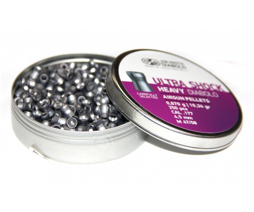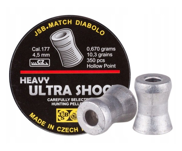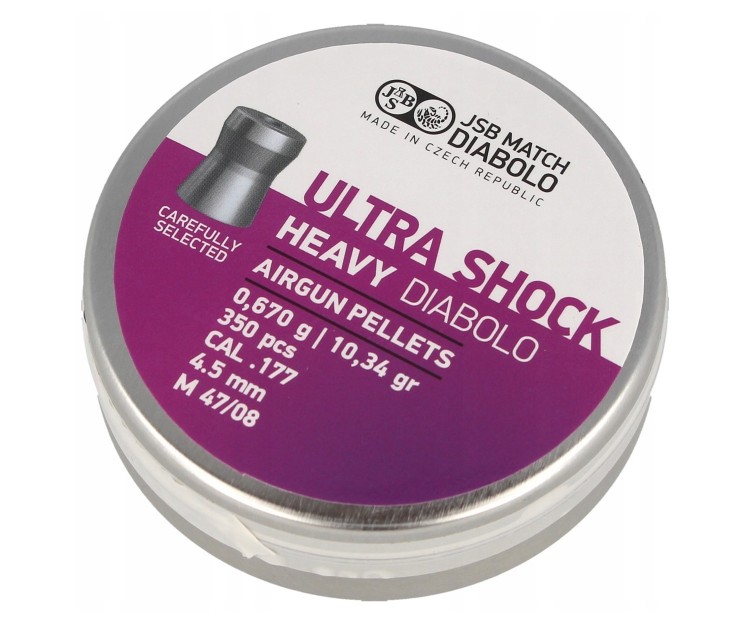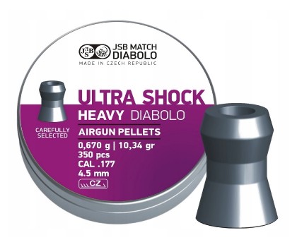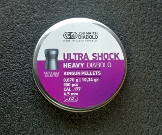 Пули JSB Ultra Shock Heavy для пневматики калибра 4,5 мм — это экспансивные тяжелые пули с углублением в головной части от чешского производителя JSB. Пули изготовлены для охоты на мелкую дичь на коротких и средних дистанциях. Благодаря своей форме оказывает шоковое воздействие на жертву при попадании. Пули в количестве 350 штук средним весом 0,67 грамм.