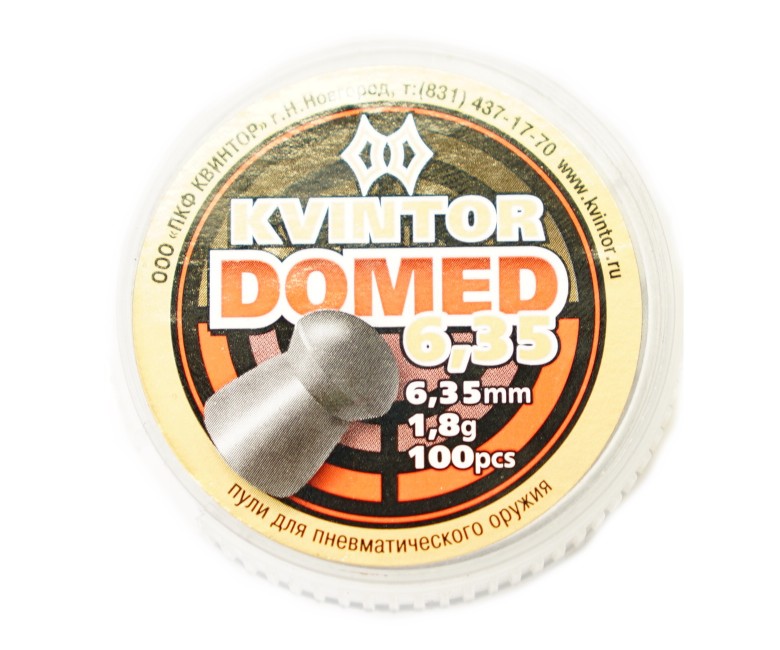Пули Kvintor Domed калибра 6,35 мм – круглоголовые пули с великолепными стрелковыми показателями, имеют низкое сопротивление в полёте благодаря форме. Проникающая способность Квинтор Домед средняя. Даже на дальних дистанциях пули обладают высокой кучностью. В упаковке 100 штук, средний вес 1,8 грамм.