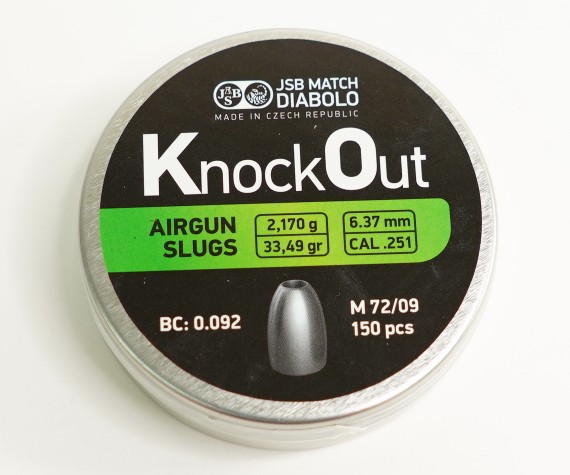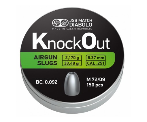Пули JSB KnockOut Slugs для пневматики калибра 6,35 мм — это тяжелые полнотелые свинцовые пули от чешского производителя JSB. Экспансивная пуля относится к классу охотничьих, обладает высокой проникающей способностью и отличной баллистикой. Пули в количестве 150 штук средним весом 2,170 грамм.