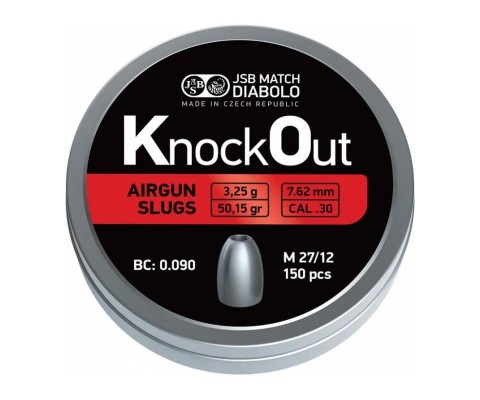 Пули JSB KnockOut Slugs для пневматики калибра 7,62 мм — это тяжелые полнотелые свинцовые пули от чешского производителя JSB. Экспансивная пуля относится к классу охотничьих, обладает высокой проникающей способностью и отличной баллистикой. Пули в количестве 150 штук средним весом 3,25 грамм.