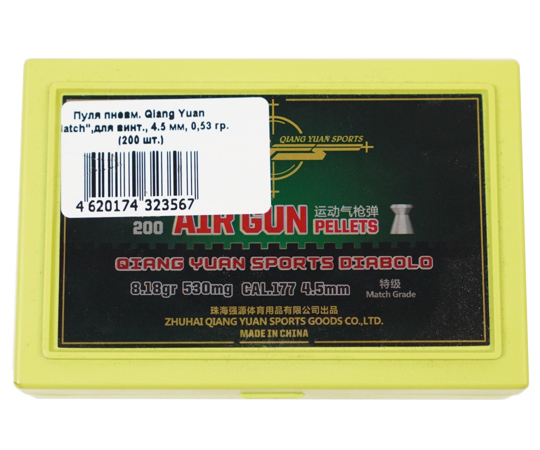 Пули Qiang Yuan Match - высокоточные пули с плоской головной частью калибра 4,5 мм для средних дистанций. В упаковке 200 штук средним весом 0,53 грамм.