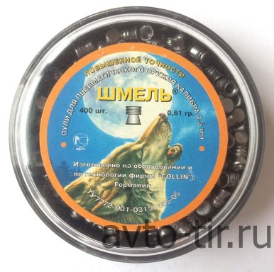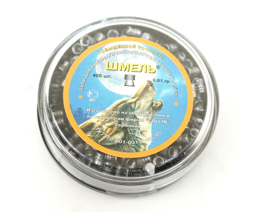 Пули Шмель повыш. точности калибра 4,5 мм — штампованные свинцовые пули с плоской головной частью. За счёт появления двух колец завихрения, потеря давления в канале минимальна, вследствие чего увеличивается начальная скорость. Благодаря высоким баллистическим характеристикам, обеспечивает высокую стабильность в полете. В упаковке 400 штук, средний вес 0,61 грамм.