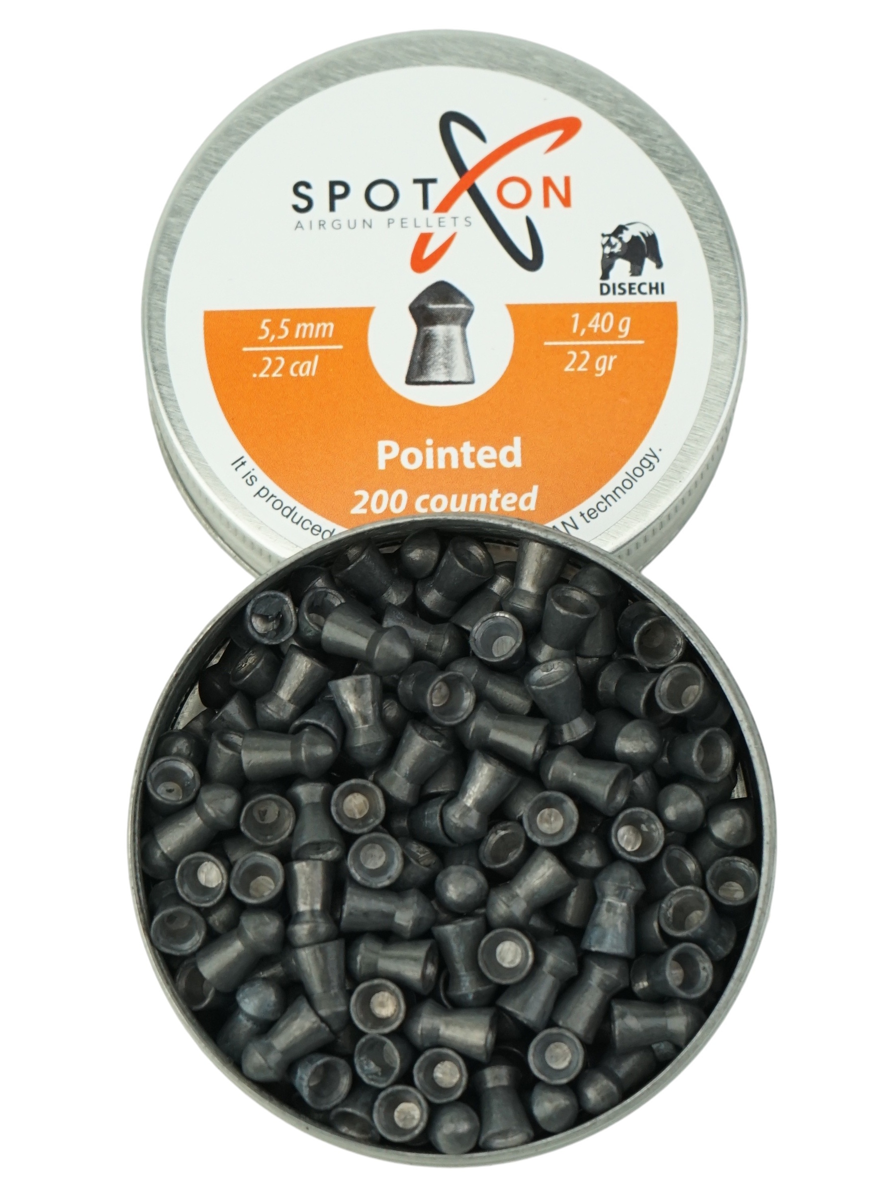 Пули SPOTON Pointed - высокоточные утяжелённые пули с конической головной частью калибра 5,5 мм для средних дистанций. В упаковке 200 штук средним весом 1,4 грамм.