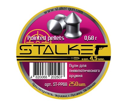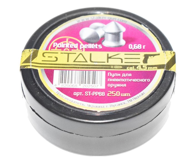 Пули Stalker Pointed pellets 0,68 г – утяжеленные свинцовые пули калибра 4,5 мм с конической головкой и гладкой поверхностью. Штампованные пули с высокой точностью и кучностью. Максимальная проникающая способность, не самые высокие аэродинамические характеристики, слабое останавливающее действие. В упаковке 250 штук.