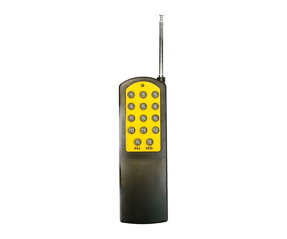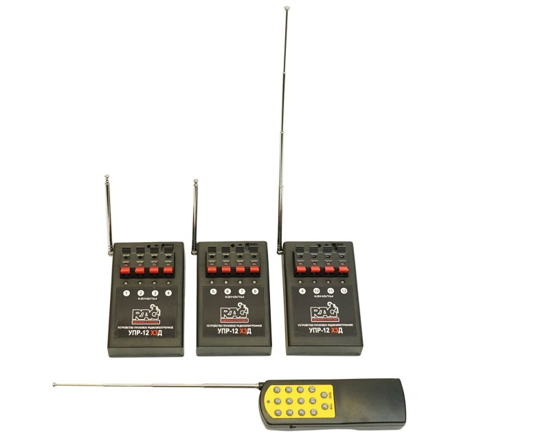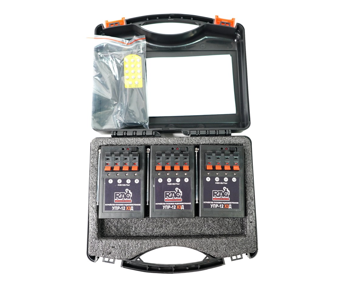 Комплект из компактного передатчика в виде 12-ти канального пульта передатчика и 3-х четырёхканальных приѐмных устройств.