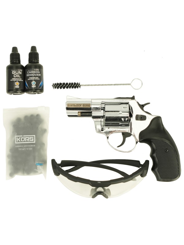Комплектация (?): | револьвер, сумка, мишени, защитные очки, масло, средство для удаления нагара, ёршик, патроны Kurs 100 шт., шарики 100 шт., паспорт (инструкция) |
