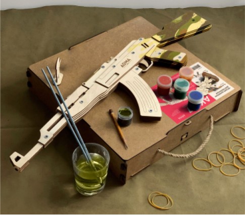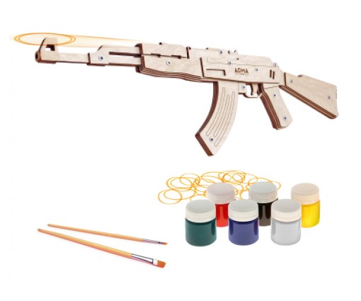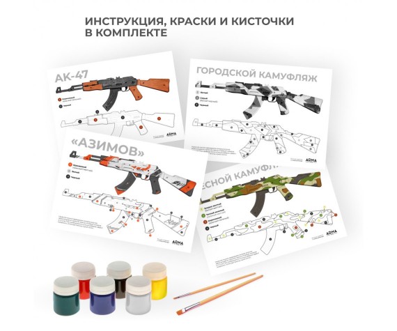 Комплектация (?): | макет-резинкострел автомата, 4 шаблона покраски, краски, кисточки, комплект зарядов, комплект мишеней, фирменная подставка, инструкция |
