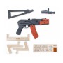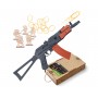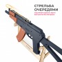 Перед вами стилизованная копия укороченного автомата Калашникова АКС-74У в формате игрушки-резинкострела. Сделана она из дерева и стреляет очередями.