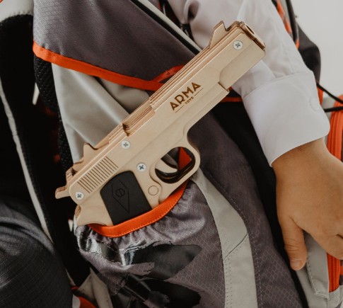 С точки зрения безопасности, резинкострел уступает лишь водному пистолету. Дальнобойность — около 5 метров, то есть, из него можно стрелять в квартире и ничего не повредить.