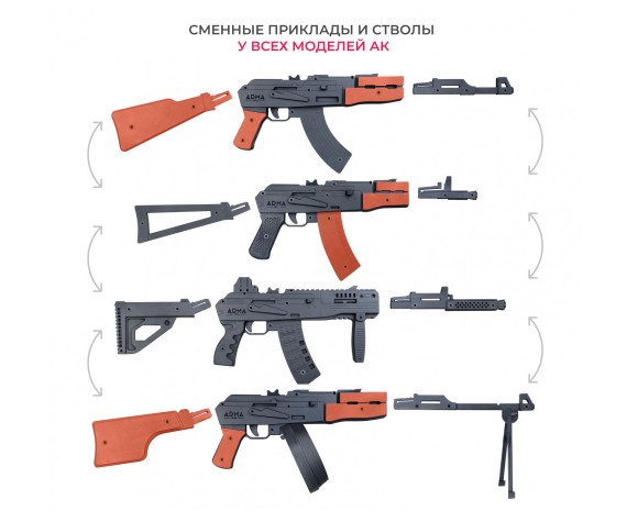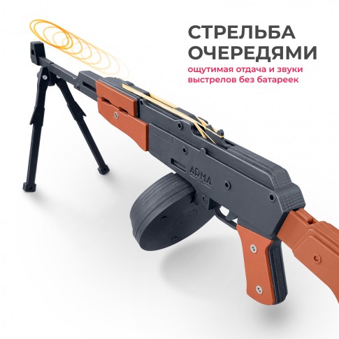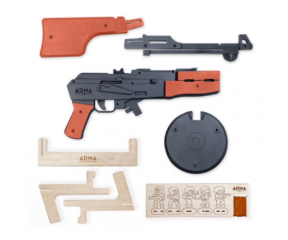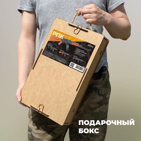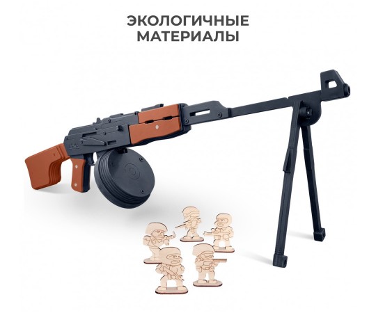 Перед вами стилизованная копия ручного пулемета Калашникова (РПК) в формате игрушки-резинкострела. Сделана она из дерева и стреляет очередями.
