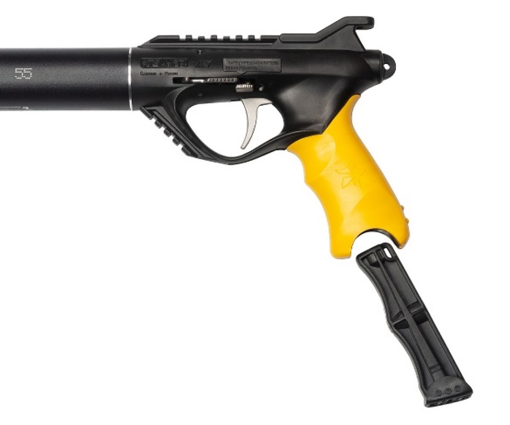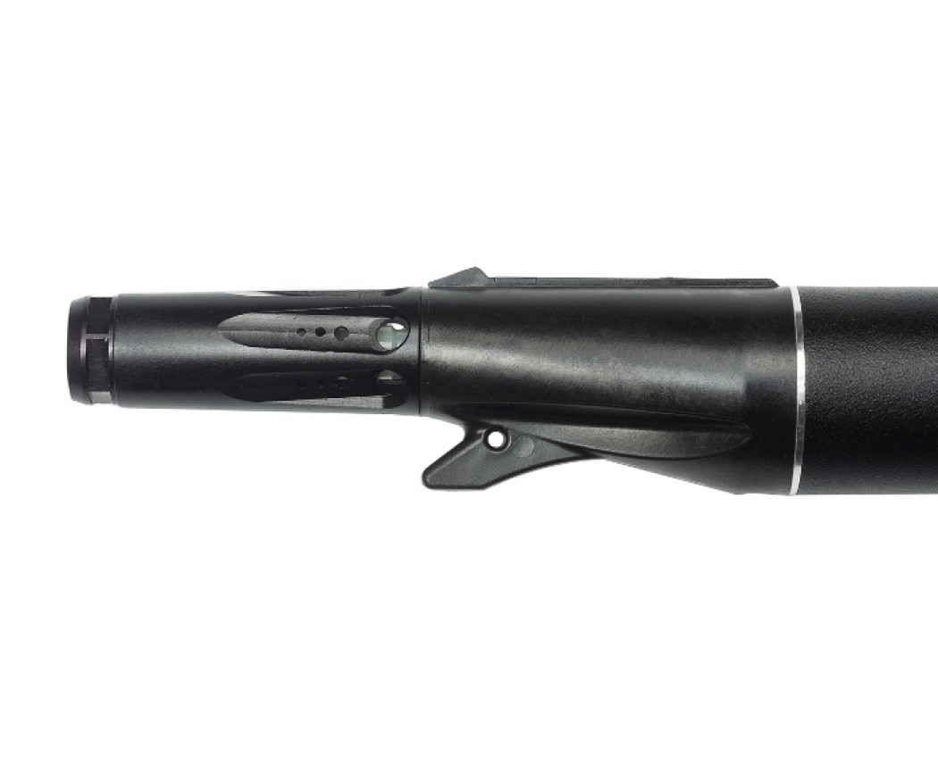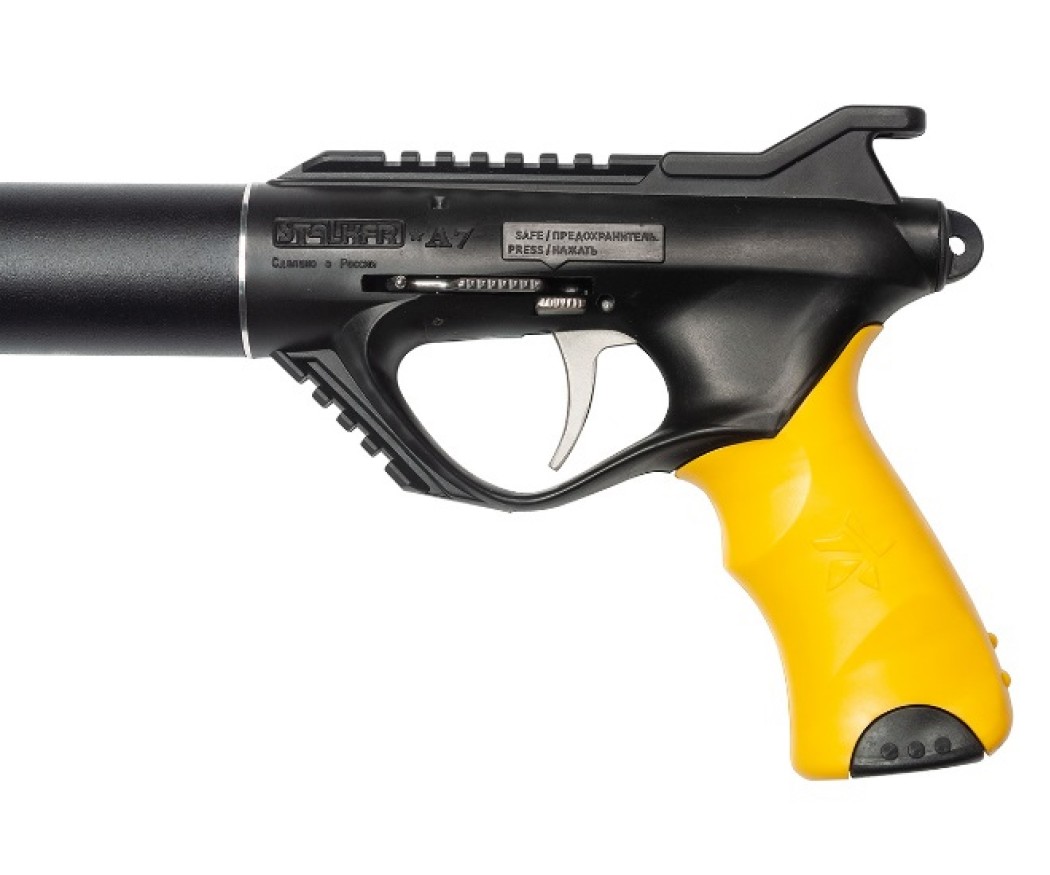 Ружьё пневматическое «Сталкер А7-45» – подводное пневматическое ружьё, предназначенное исключительно для любительской подводной охоты, должно использоваться полностью погруженным под воду. Имеет удлиненную рукоять с антифрикционной (нескользящей) накладкой и широкую спусковую скобу, обеспечивая максимальный комфорт, даже в зимних перчатках. Удобный боковой линесброс позволяет осуществлять эстетичную намотку линя, параллельно стволу. Все узлы спускового механизма выполнены из нержавеющей стали. Ствол (нержавейка) смещён вверх для повышения точности при выстреле.
