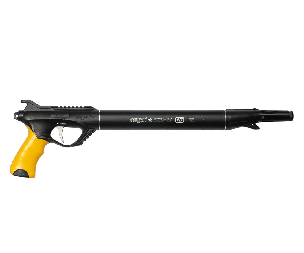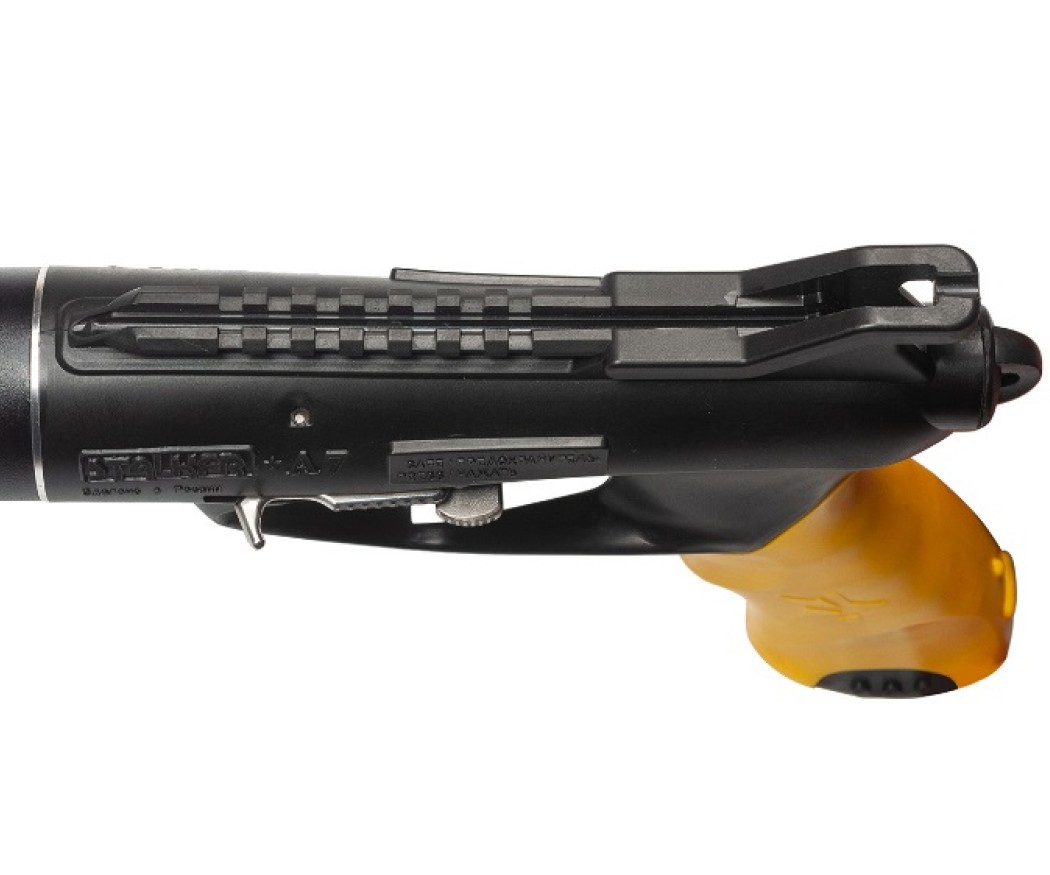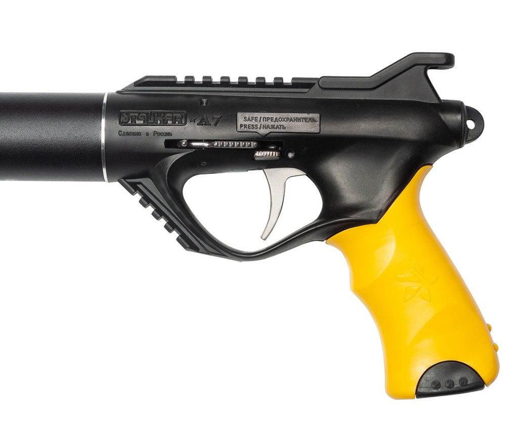 Ружьё пневматическое «Сталкер А7-95» – подводное пневматическое ружьё, предназначенное исключительно для любительской подводной охоты, должно использоваться полностью погруженным под воду. Имеет удлиненную рукоять с антифрикционной (нескользящей) накладкой и широкую спусковую скобу, обеспечивая максимальный комфорт, даже в зимних перчатках. Удобный боковой линесброс позволяет осуществлять эстетичную намотку линя, параллельно стволу. Все узлы спускового механизма выполнены из нержавеющей стали. Ствол (нержавейка) смещён вверх для повышения точности при выстреле.