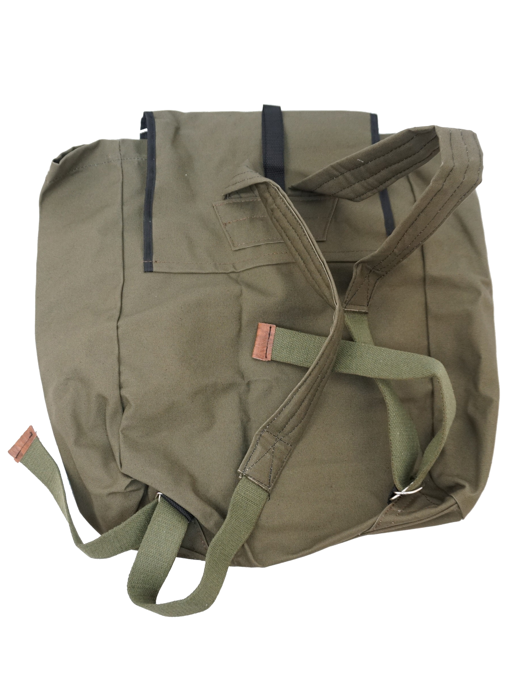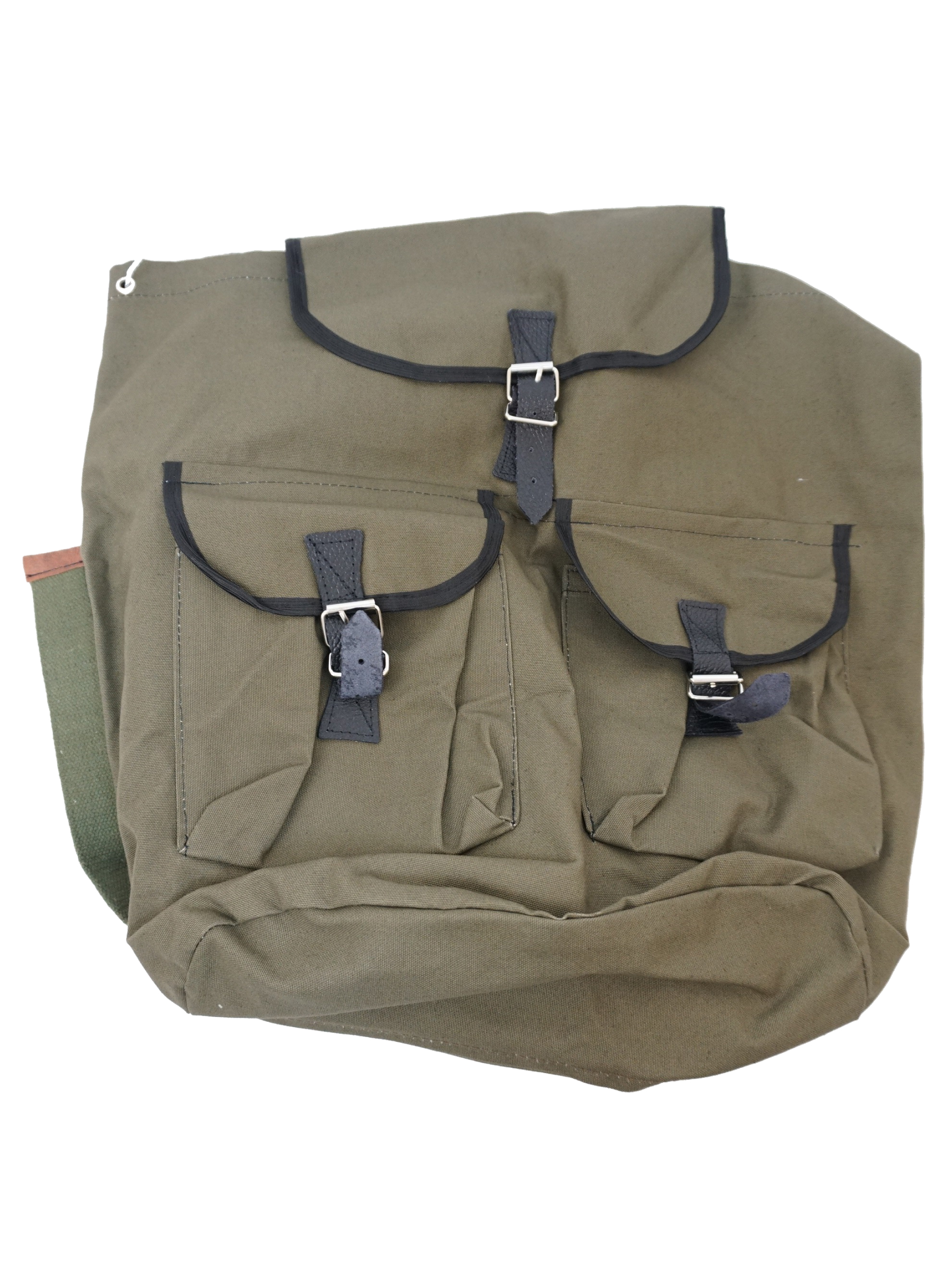 Этот рюкзак имеет 2 кармашка с передней части, закрываются они на ремешки, кстати, из кожи. Горловина рюкзака затягивается шнурком, а крышка так же закрывается 2 кожаными ремешками. На задней стороне рюкзака имеется кольцо металлическое, для подвешивания рюкзака и 2 лямки из прочных строп.