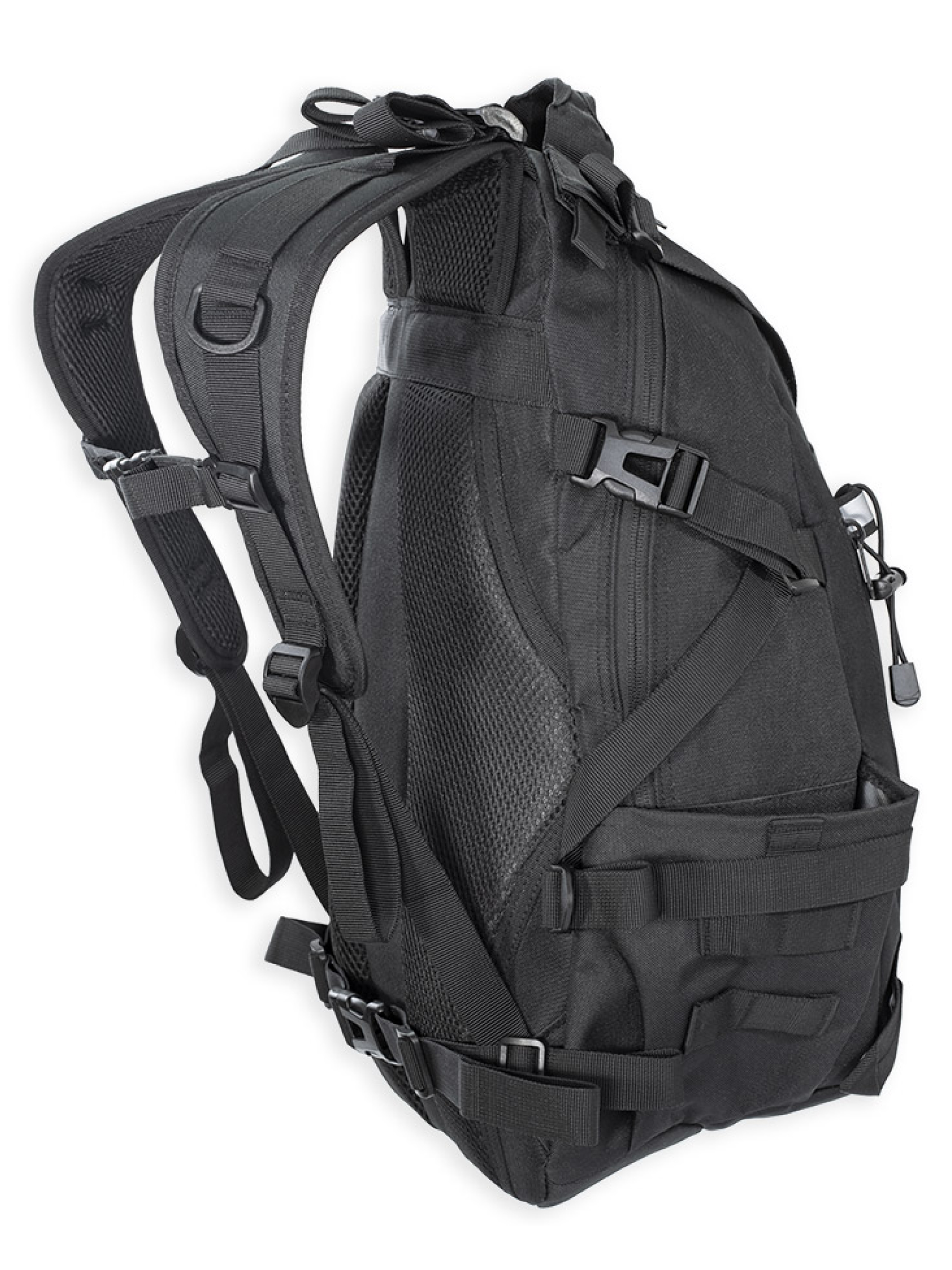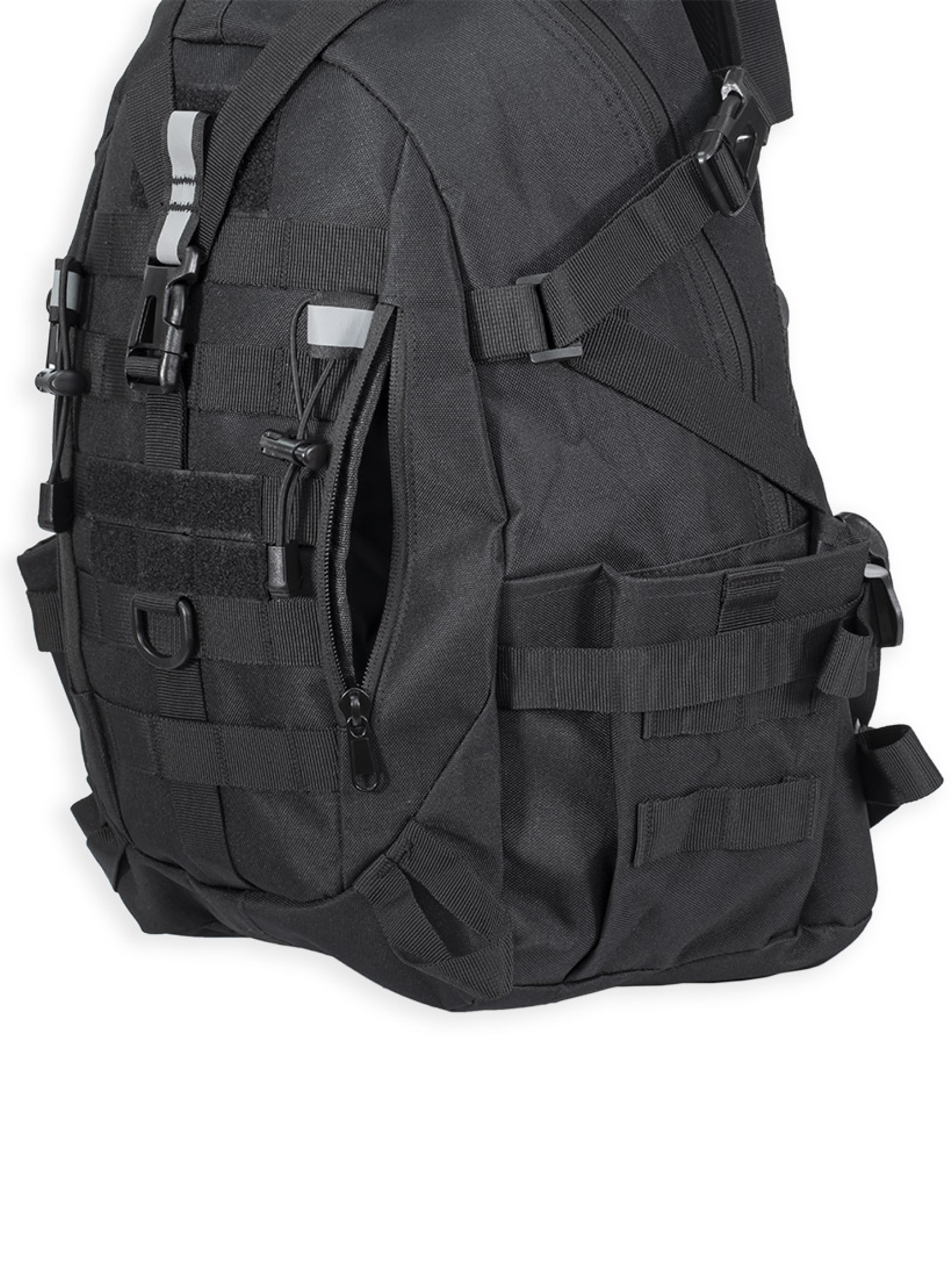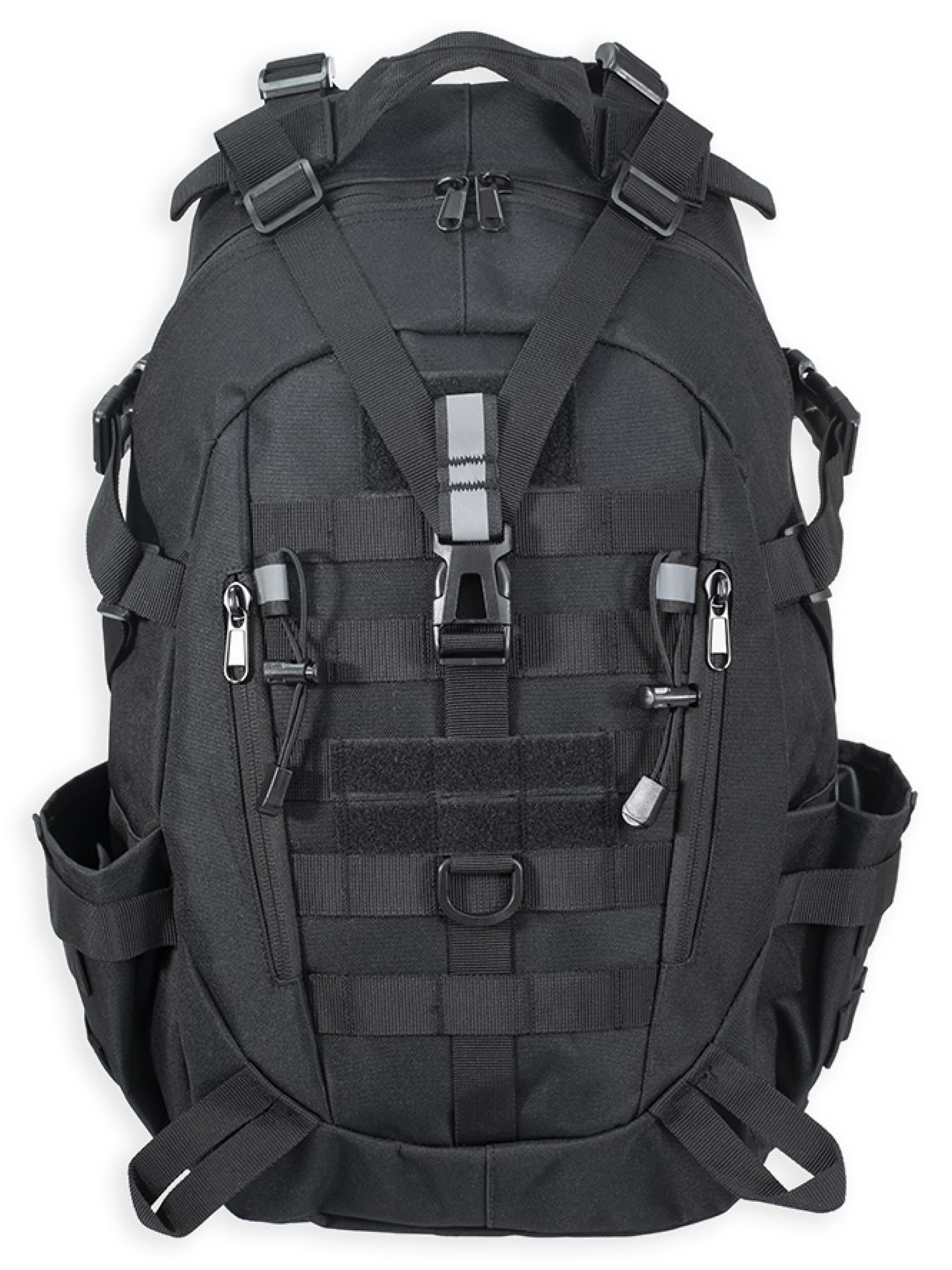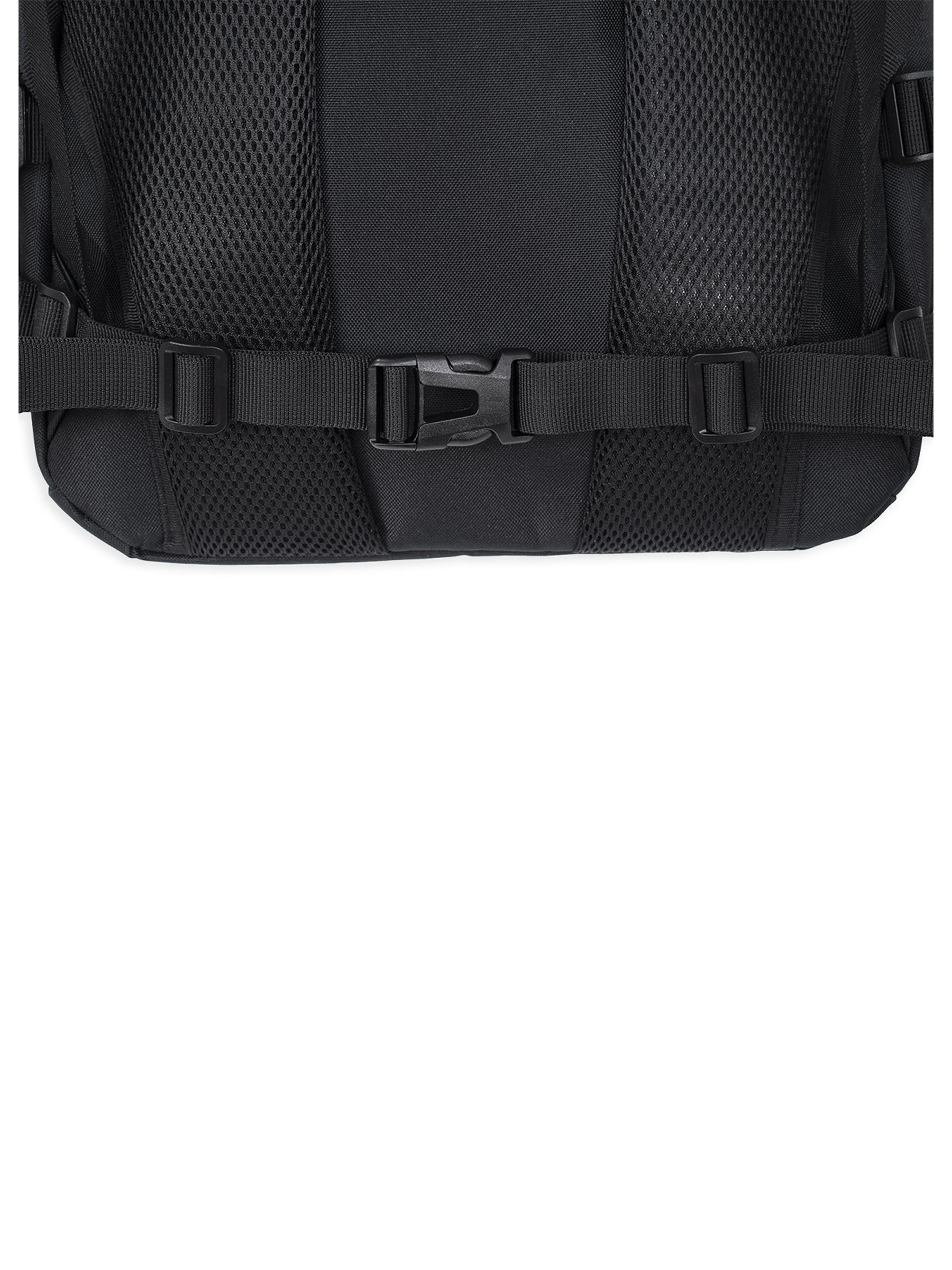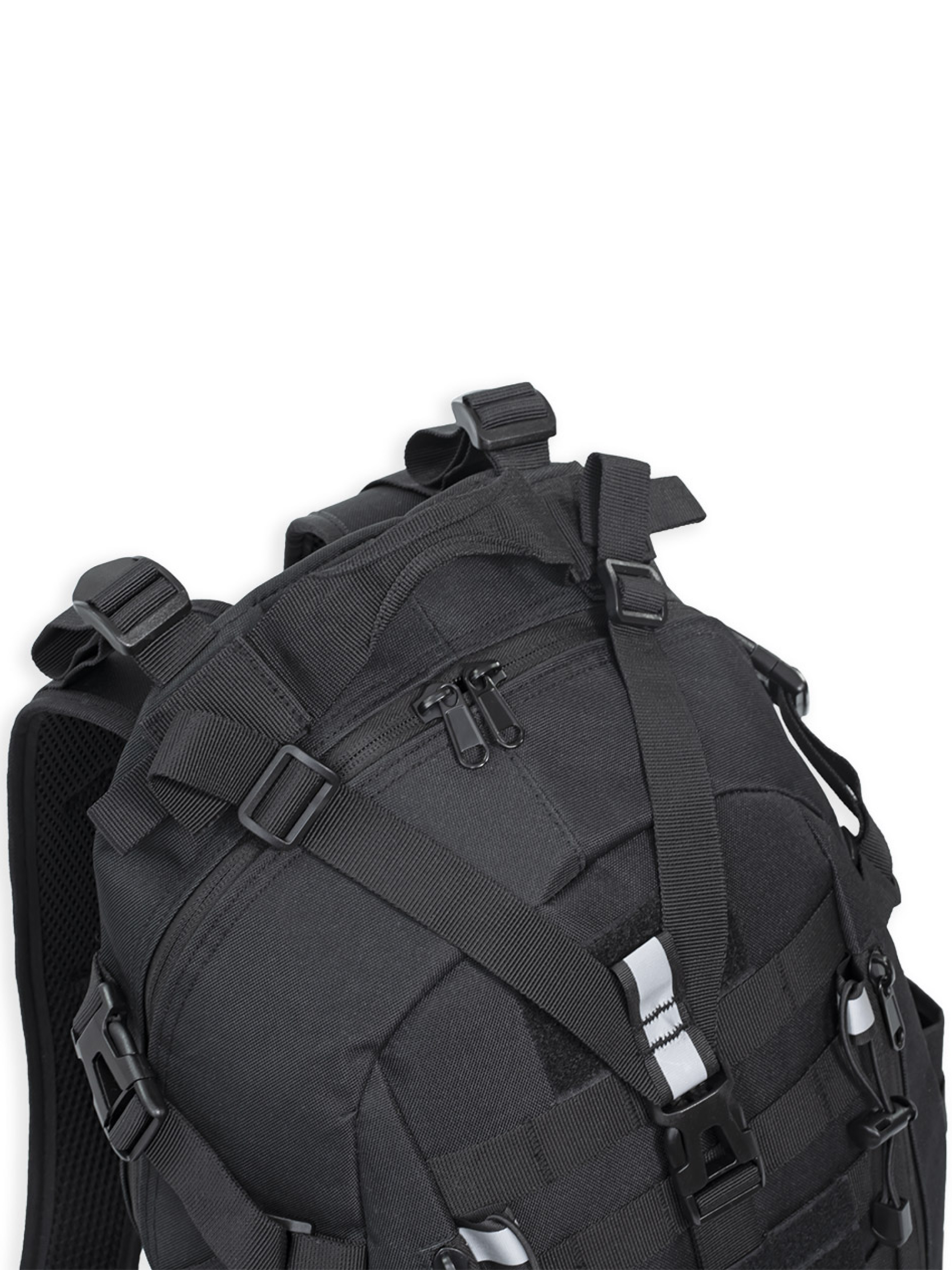 Рюкзак имеет качественную фурнитуру. Молнии изготовлены из нержавеющей стали. На молнии основного отделения установлены двойные бегунки. Помимо молнии, основное отделение закрывается на фастекс, установленный на регулируемой стропе. Прочные ABS-фастексы обеспечивают удобство использования. Система MOLLE на передней и боковых сторонах обеспечивает возможность крепления дополнительных подсумков и снаряжения. Специальные крепления: нейлоновые петли и эластичные шнуры с фиксаторами позволяют легко фиксировать дополнительное оборудование и снаряжение.