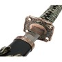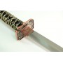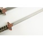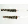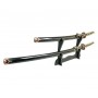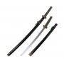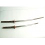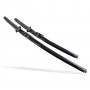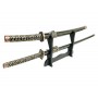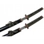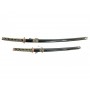Набор из двух японских мечей с черными классическими ножнами и цубой окрашенной под медь с изображением дракона. Состоит из одного меча Катана и одного меча Вакидзаси. Настольная подставка в комплекте.