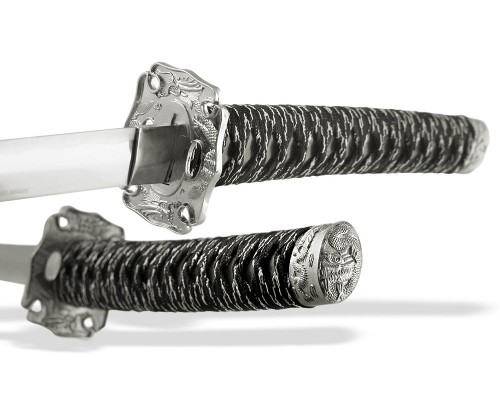 Набор классических японских самурайских мечей с чёрными ножнами. Набор состоит из одного меча Катана и одного меча Вакидзаси. Настольная подставка в комплекте. Данный набор отлично подходит для оформления интерьера в классическом японском стиле.