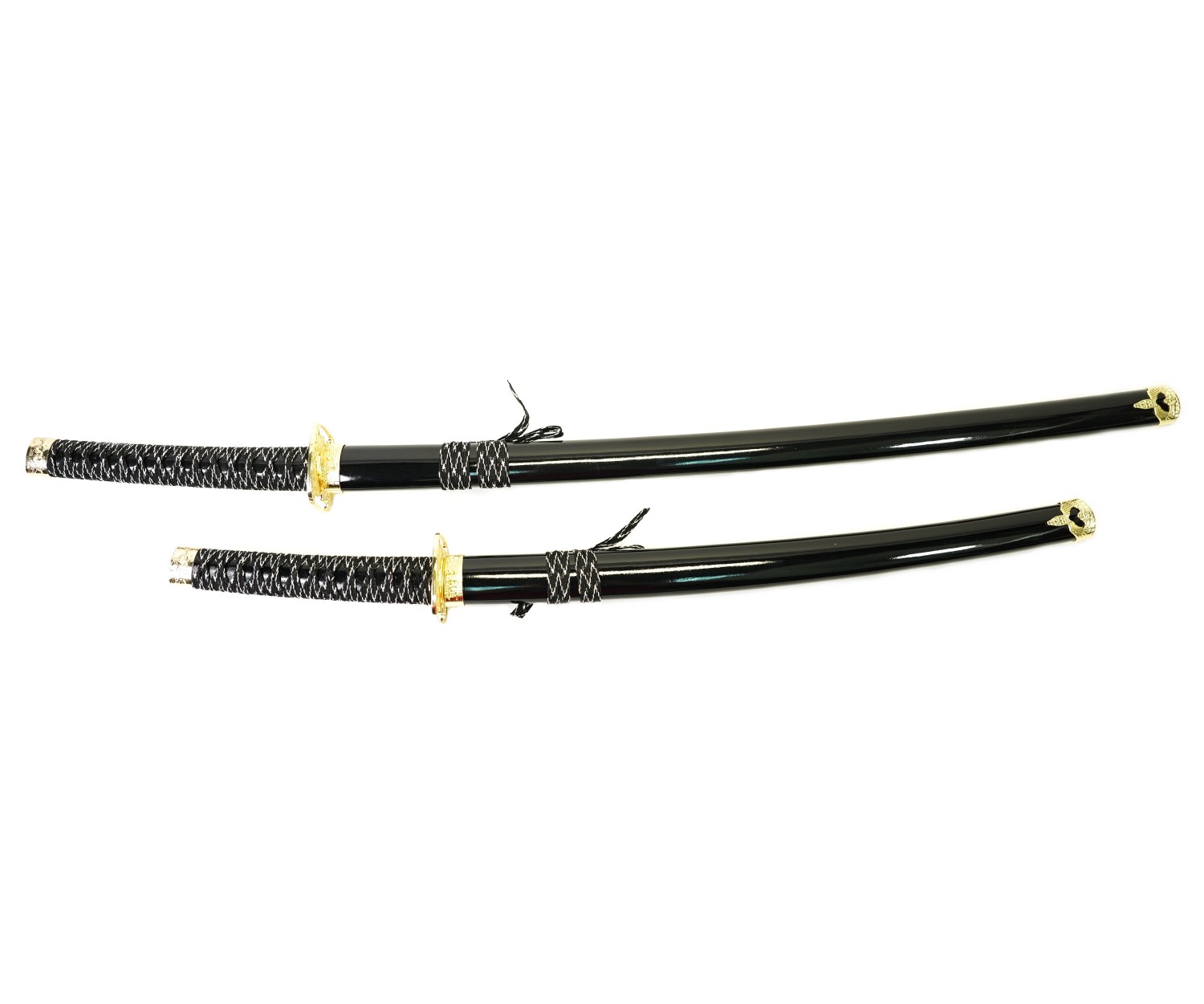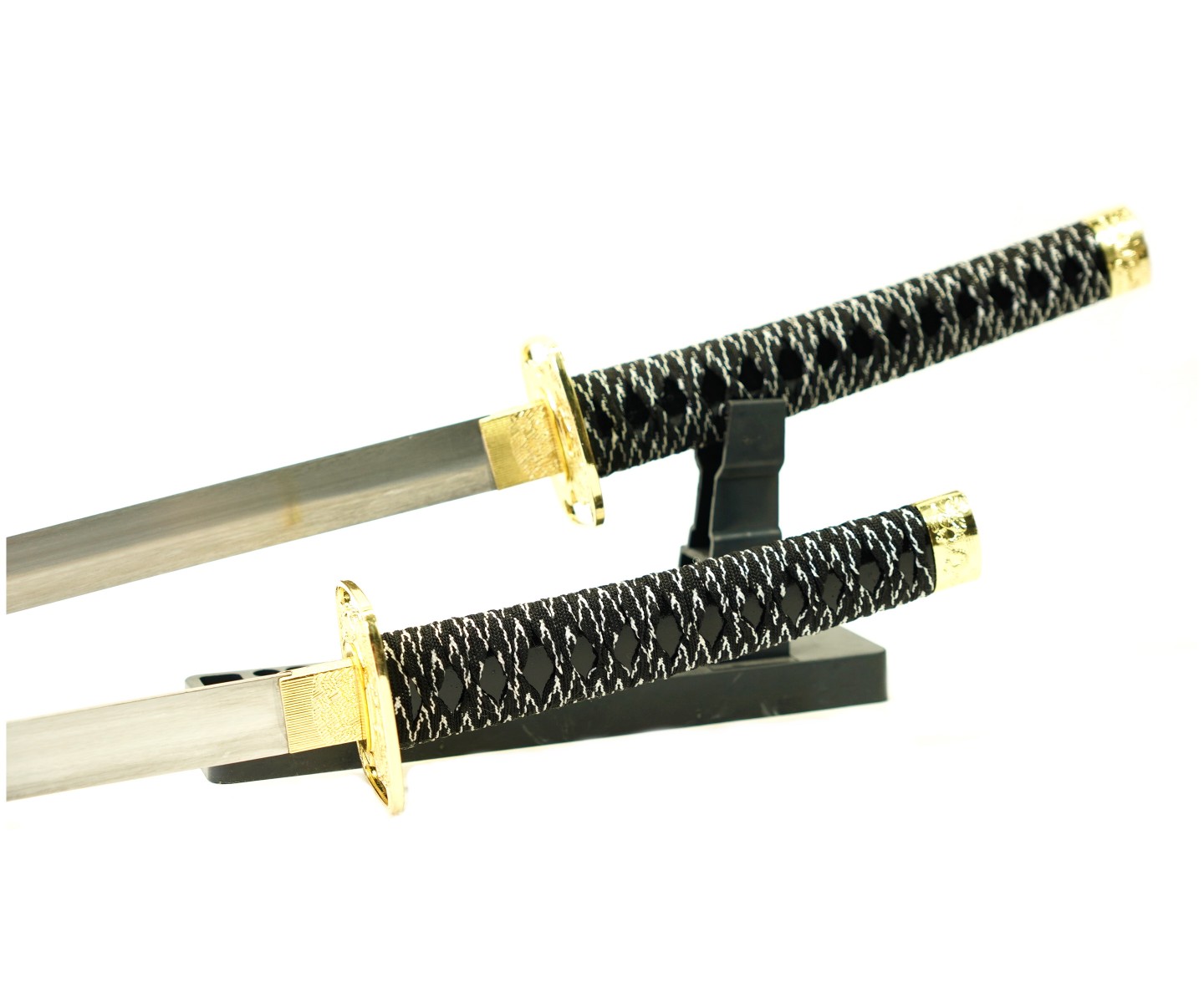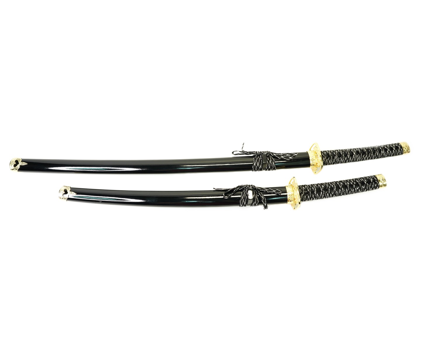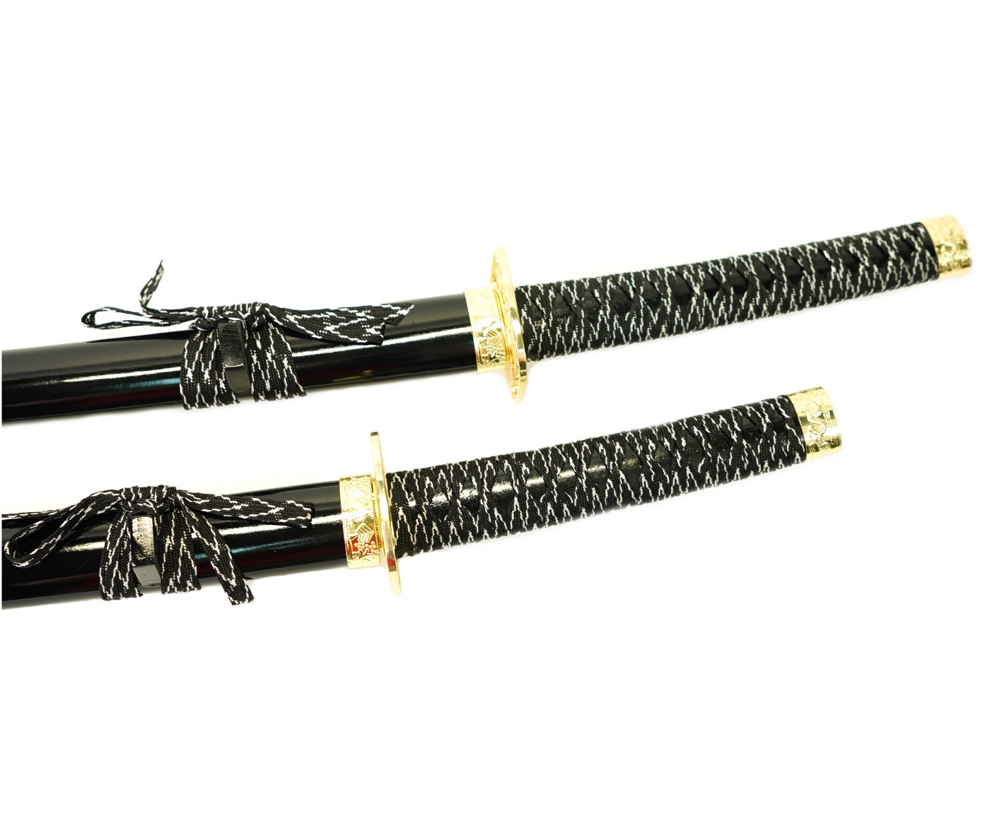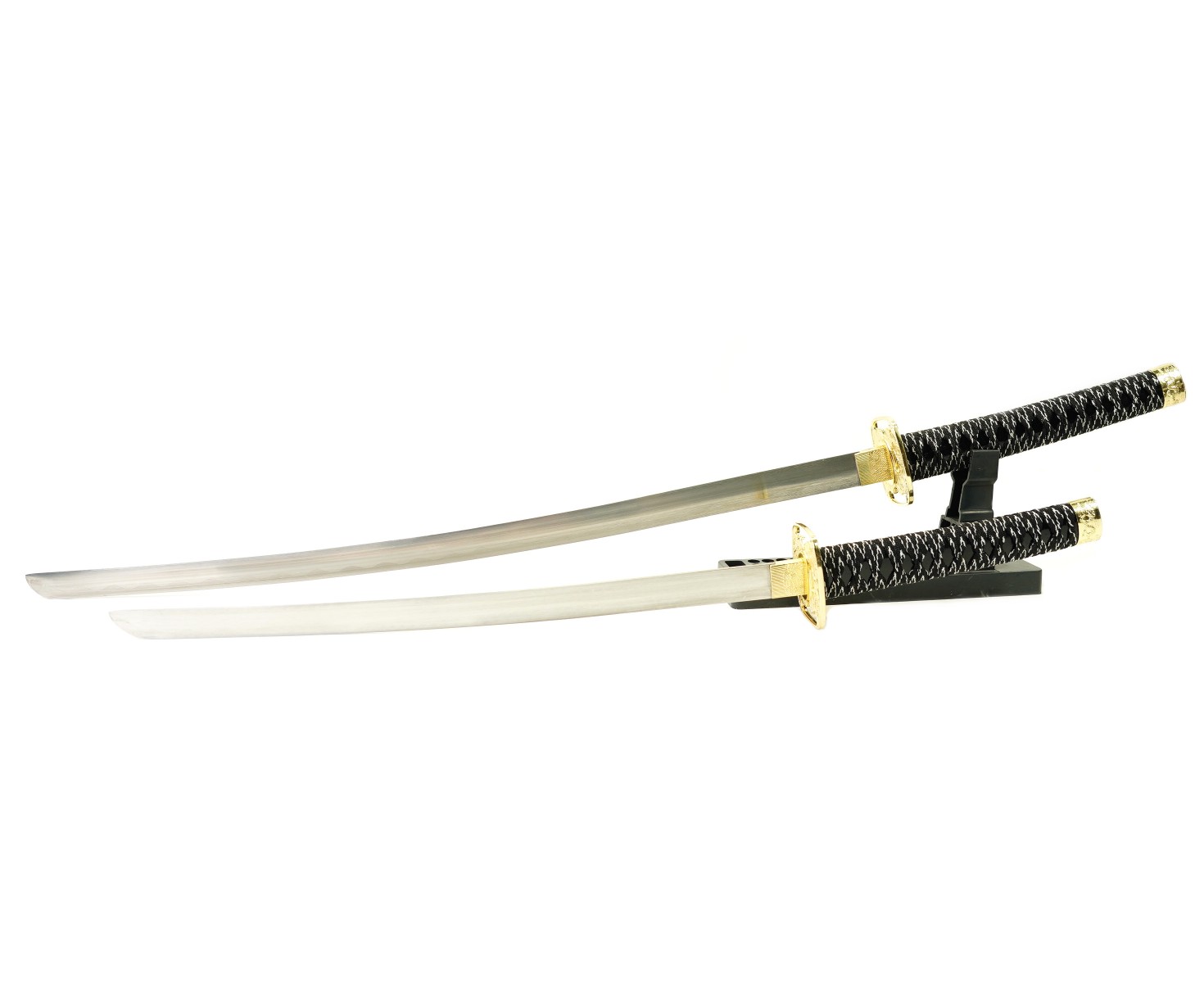 Великолепный набор самурайских мечей с классическими ножнами черного цвета и цубой окрашенной под золото. Состоит из одного меча Катана и одного меча Вакидзаси. Настольная подставка в комплекте.