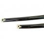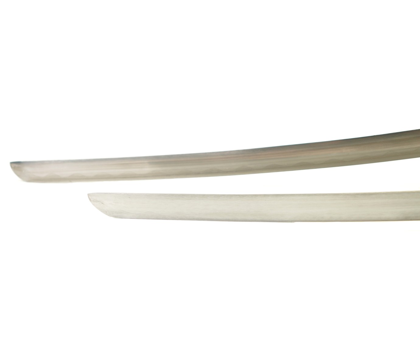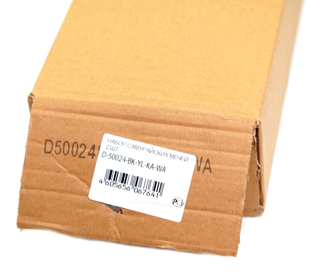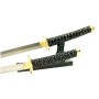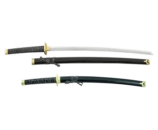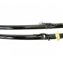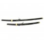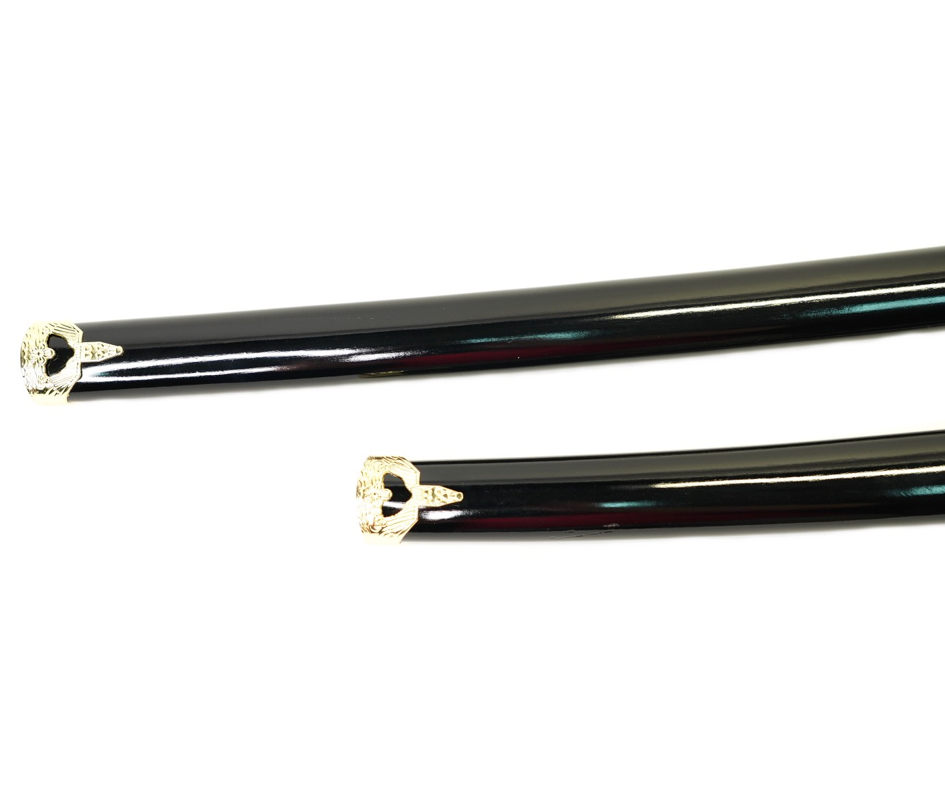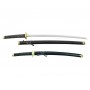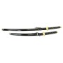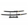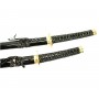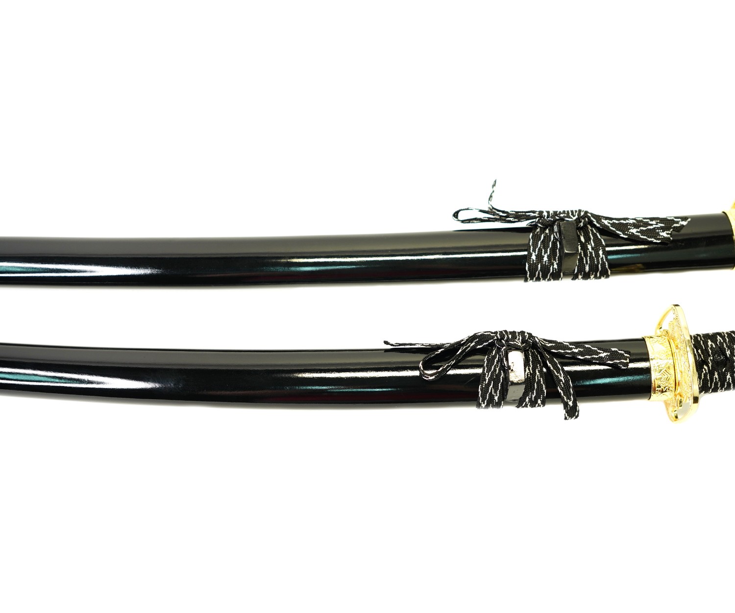 Великолепный набор самурайских мечей с классическими ножнами черного цвета и цубой окрашенной под золото. Состоит из одного меча Катана и одного меча Вакидзаси. Настольная подставка в комплекте.