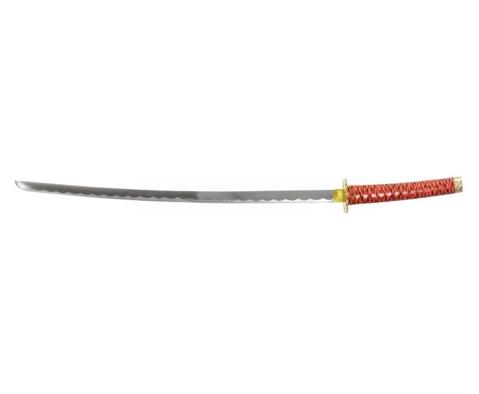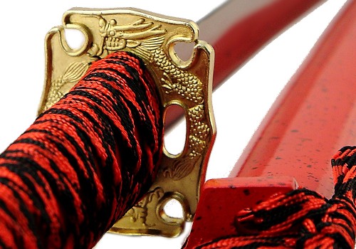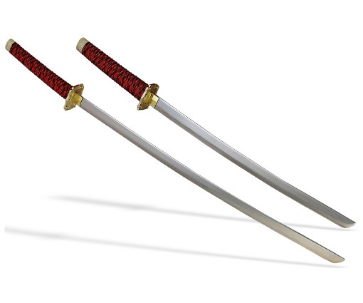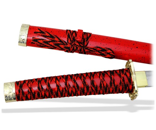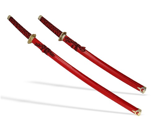 Роскошный набор самурайских мечей с яркими ножнами цвета алый мрамор и цубой окрашенной под золото. Состоит из одного меча Катана и одного меча Вакидзаси. Великолепный подарок поклонникам японской культуры. Также подходит для оформления стиля и дизайна в японском стиле. Настольная подставка в комплекте.