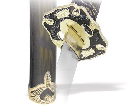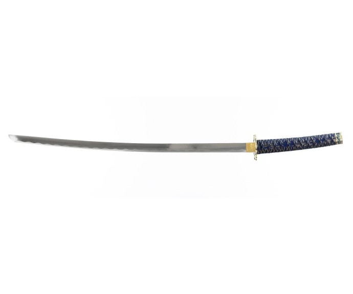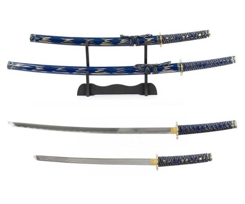 Необычный набор японских самурайских мечей с сине-желтыми ножнами и цубой черно-золотого цвета. Состоит из одного меча Катана и одного меча Вакидзаси. Настольная подставка в комплекте.